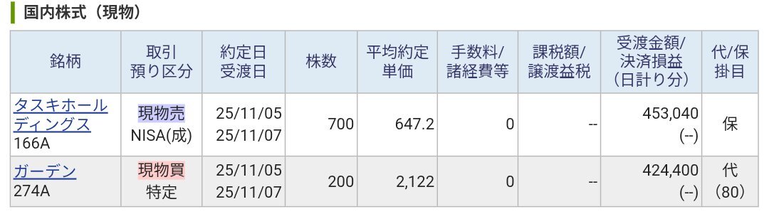 タスキHD(新NISA)647.2円で700株売却 実現損益(税引前)+60340円 ガーデン2122円で200株ナンピン 5800株→6000株 平均取得単価2190円 pic.x.com/MsVJirheJz