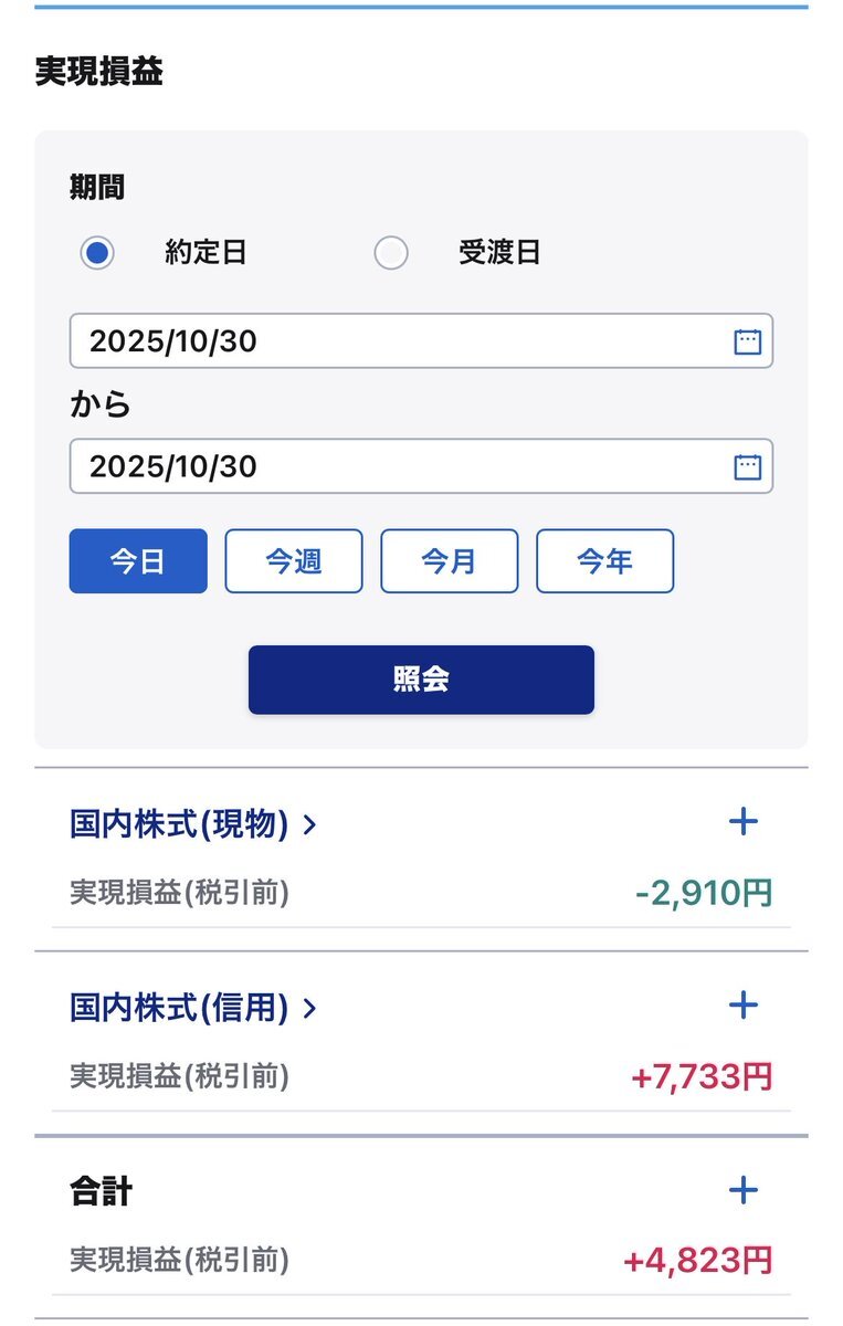 📊【10月30日 収支報告】 本日の実現損益:+4,823円(税引前) ・現物:−2,910円 ・信用:+7,733円 前半は軟調な展開も、後場でリバウンドを拾いプラス着地。 短期目線では“守りながら攻める”一日。 決算シーズンの波にのみ込まれず、 地に足をつけて次のタイミングを狙う。 #日本株 #投資記録 pic.x.com/D6FDKC4Pyt