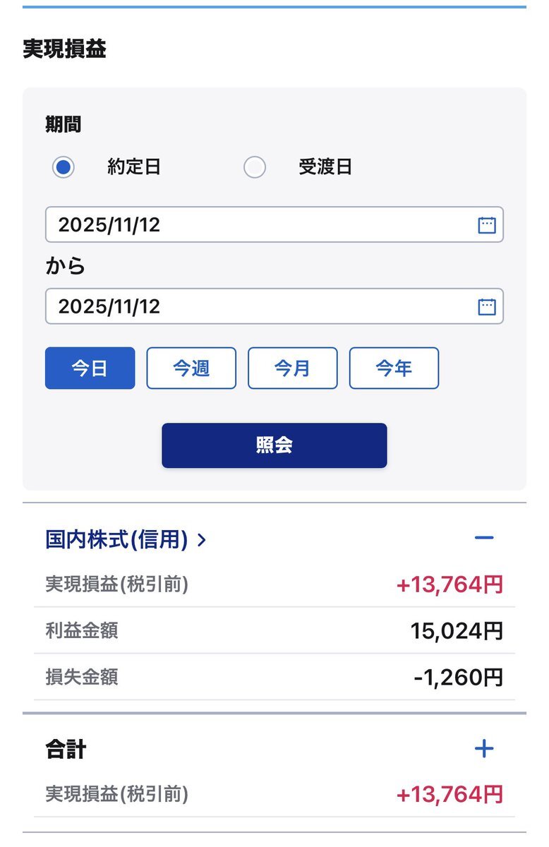 📊【本日のトレード結果】 2025年11月12日(水) 実現損益:+13,764円(税引前) 利益:15,024円 / 損失:−1,260円 前場はAI・半導体に資金が集まり、 波に乗ったあと、一歩引いて冷静に利確。 欲よりリズム、を意識した一日でした。 そして今日から債券ETFの積み立てを開始。 pic.x.com/i6Gs6Cpu2a