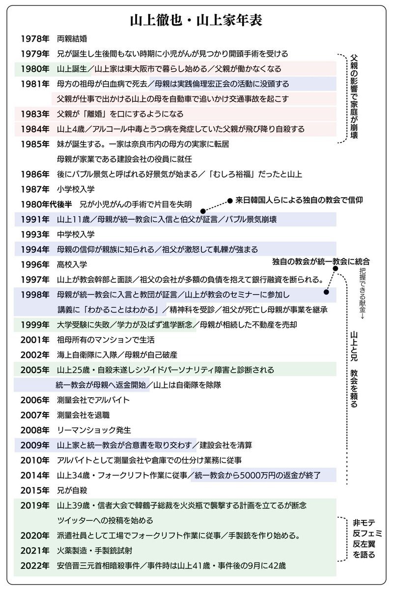 山上は統一教会時代の家庭連合による影響ばかりが語られ、それは要因として確実にあっただろうが、破滅的だった父が家庭を崩壊させているとき母親が没頭した実践倫理宏正会も原点として比重が小さくない。また兄とともに父親像の欠落や負の存在となまじ裕福だった環境が影を落としている。 妹は父の