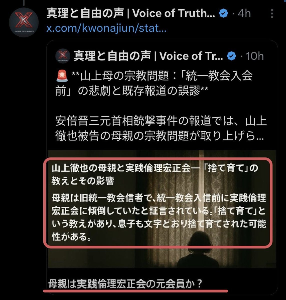 nakayukiさんのプレゼント記事。今日の夜9時まで読める。 山上被告の母が参加した朝の集いは 実践倫理宏正会 のことですね。Grok に聞いたら統一教会との関係はないと言うが、寄付の問題などを指摘するサイトもある。 x.com/nyuki333/statu…