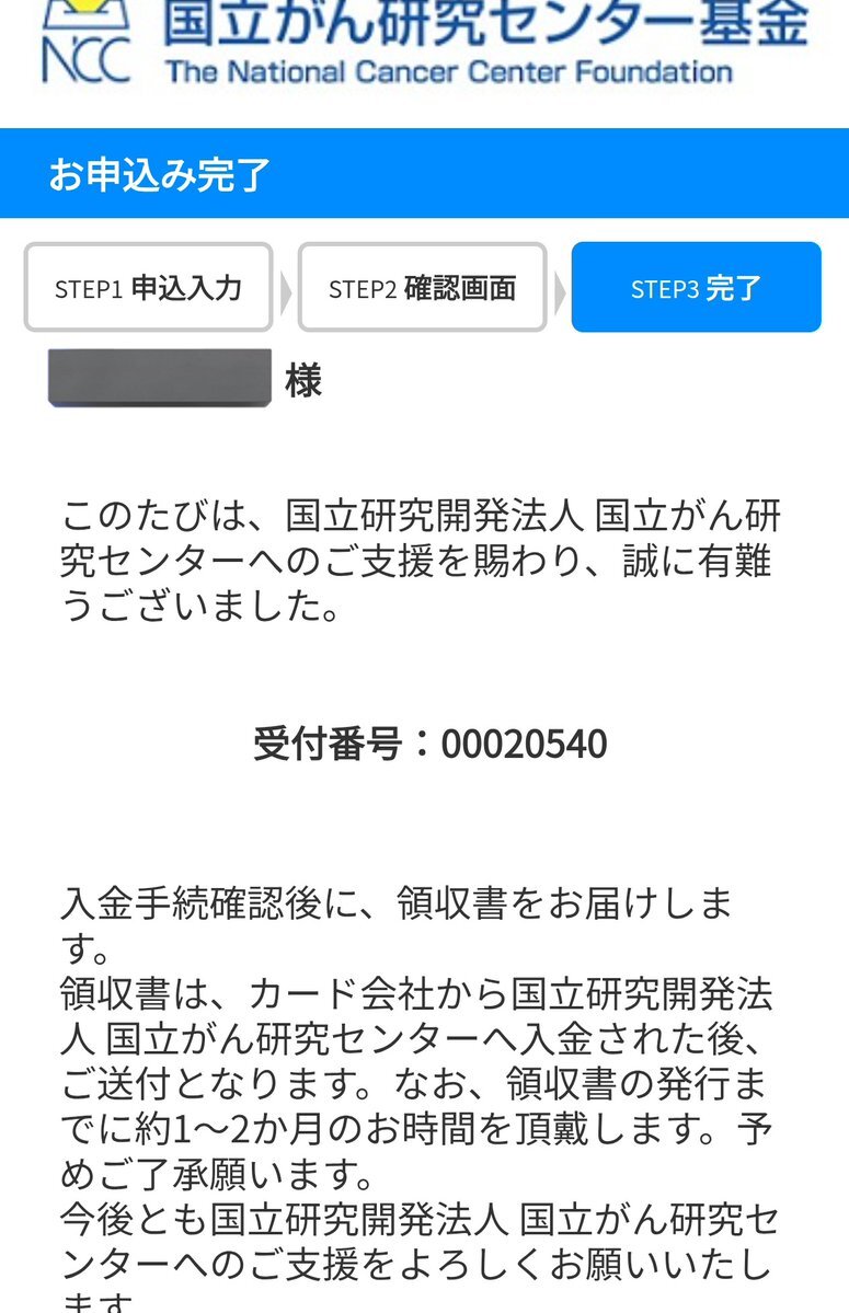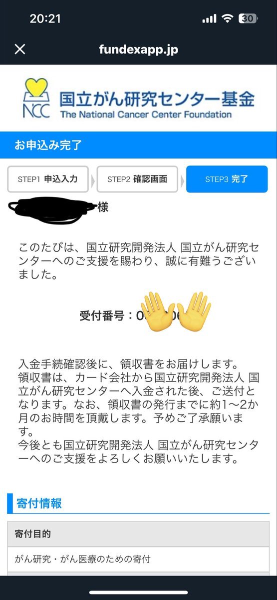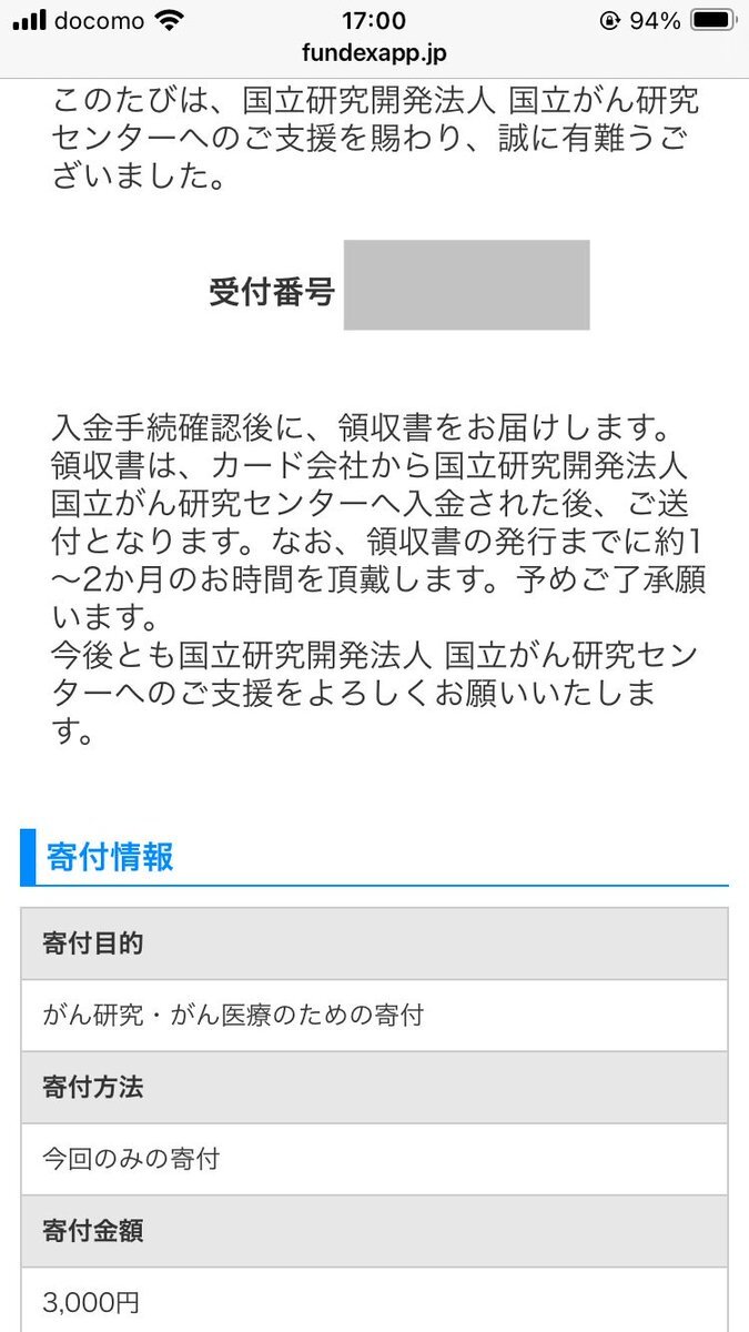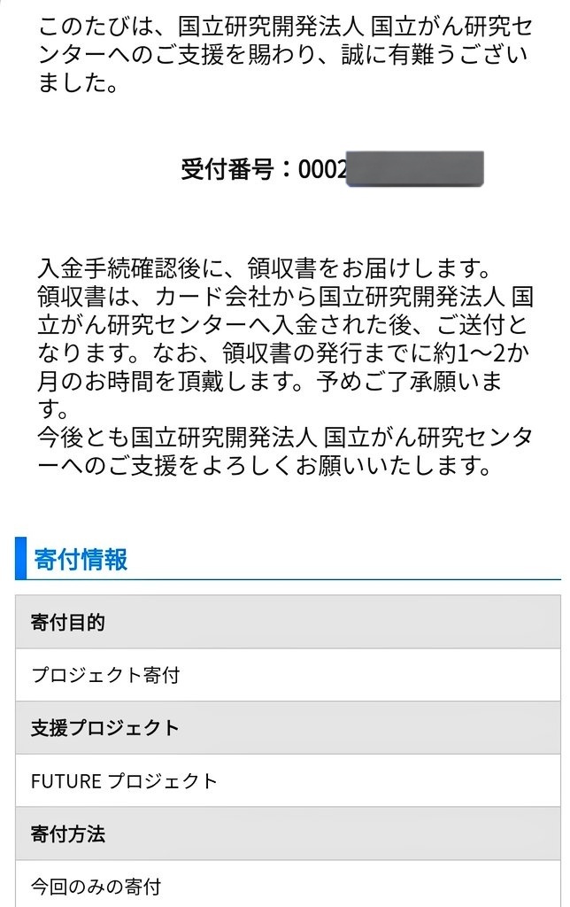 ちなみに国立がん研究センター基金の寄付番号。さっき自分が寄付した時点で20500超えてます