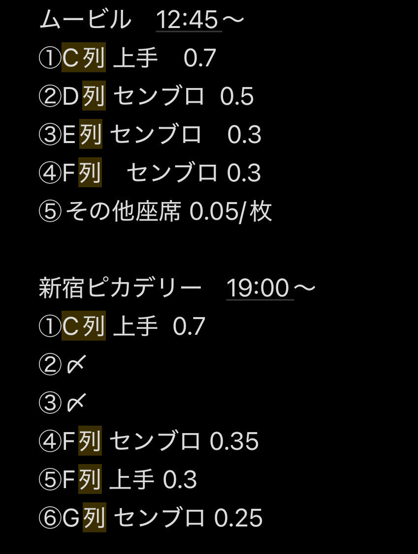 @_ 富士山とコーヒーとしあわせの数式 公開記念舞台挨拶 【譲】10/25 19:00- 新宿 ④H列 ⑤I列 ⑥K列 ⑦N列 (④-⑦ 全てセンブロ) 【求】 即決 ④⑤0.1 ⑥⑦0.05 当日手渡しでのお取引優先。アプリ通し可能です。希望額記載の上DMまでご連絡ください。#JO1譲 #DXTEEN譲