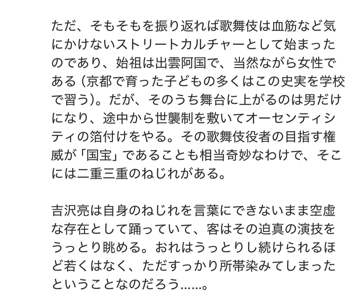 そもそも歌舞伎の始祖は女性なのに途中で女性を排除している上に、『国宝』の男たちが芸以外のことを考えなくて済んでいるのは、彼らが通る自動ドアをだいたい女が手動で開けているからなんだけど、それ無視して感動できるのは日本人の私から見てもすごいと思う(当時の感想メモ) x.com/8bit_8bit_/sta…