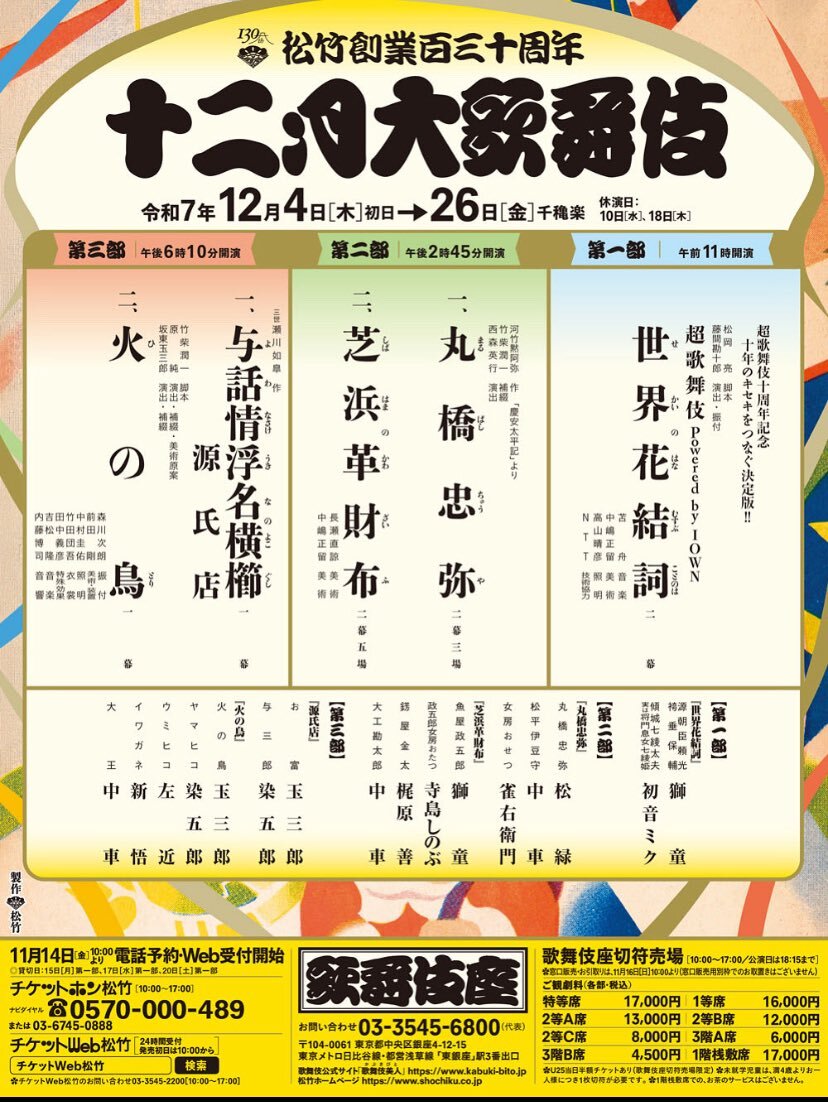 母が玉三郎ファンなので、さっき発売になった12月歌舞伎のチケットを取ってあげた 驚いたのが一部に初音ミク出演ってあるんだが、何?初音ミクって実在のもの(私疎くて)? 2部には寺島しのぶが出演、彼女は歌舞伎の家に生まれたからなんだろうけど、歌舞伎座も例外的に女性が出る時代なんだな。 pic.x.com/DfMSXDVNPa