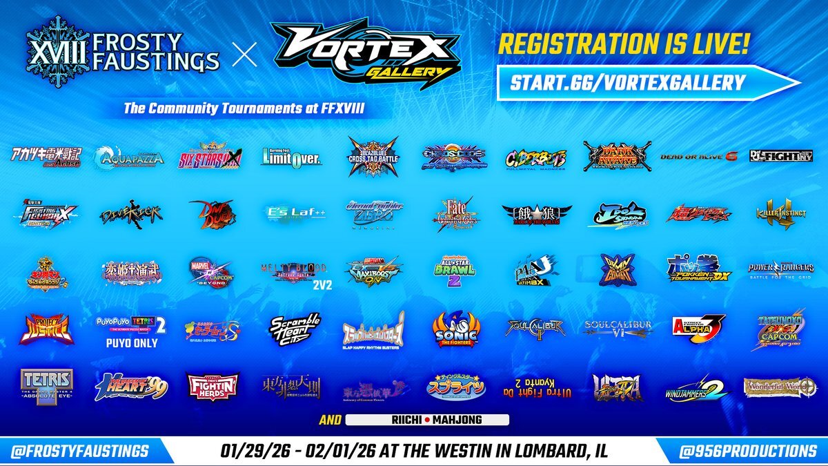 Presenting your COMPLETE lineup for Vortex Gallery at Frosty Faustings XVIII! Featuring 51 tournaments in total! We had to bring Mahjong in for the culture 🀄 Represent your fave with us and pre-reg for 4 days of community tournaments at start.gg/vortexgallery #FFXVIII2026