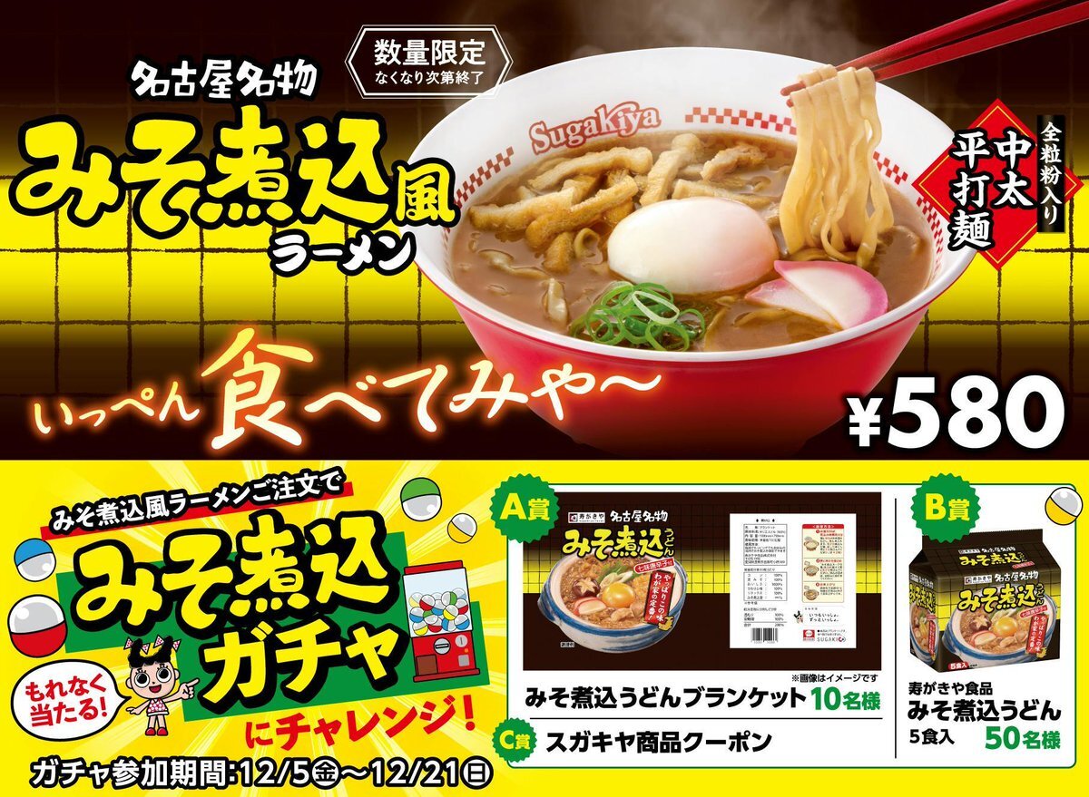 本日より #みそ煮込風ラーメン が登場❣️ お店の味もぜひ食べてみてください😋 アプリご提示でご注文いただいた方は「みそ煮込みガチャ」にも参加可能です🤗 12/5(金)にアプリ内でガチャチケットを配信しますのでお楽しみに♪ sugakico.co.jp/news/misonikom…