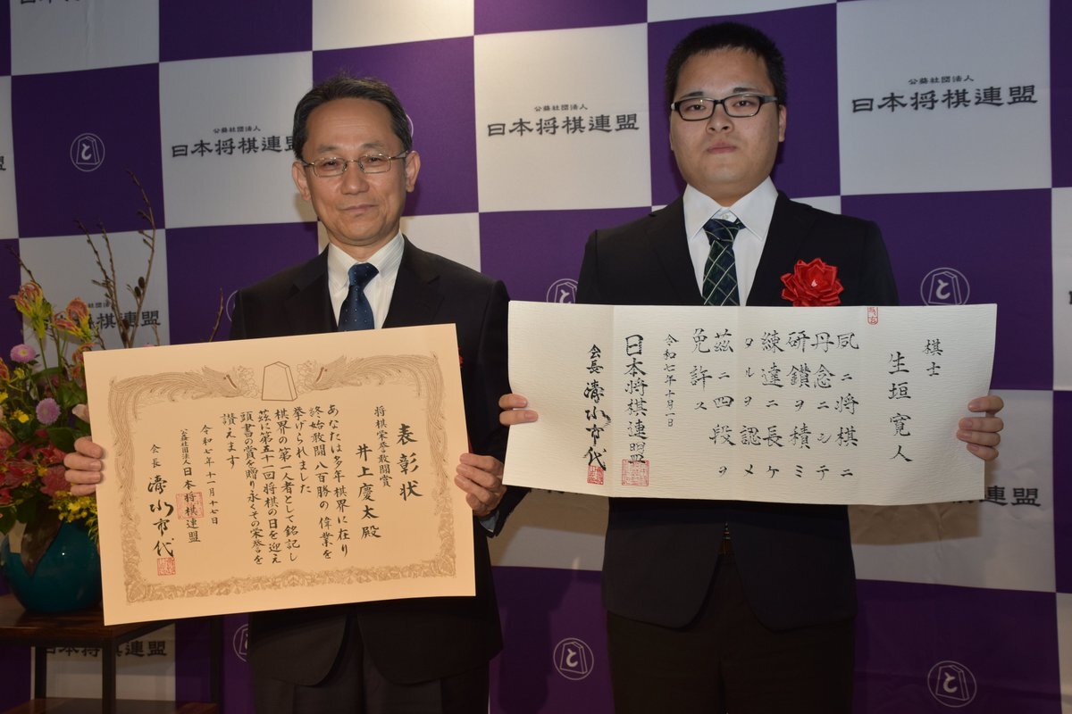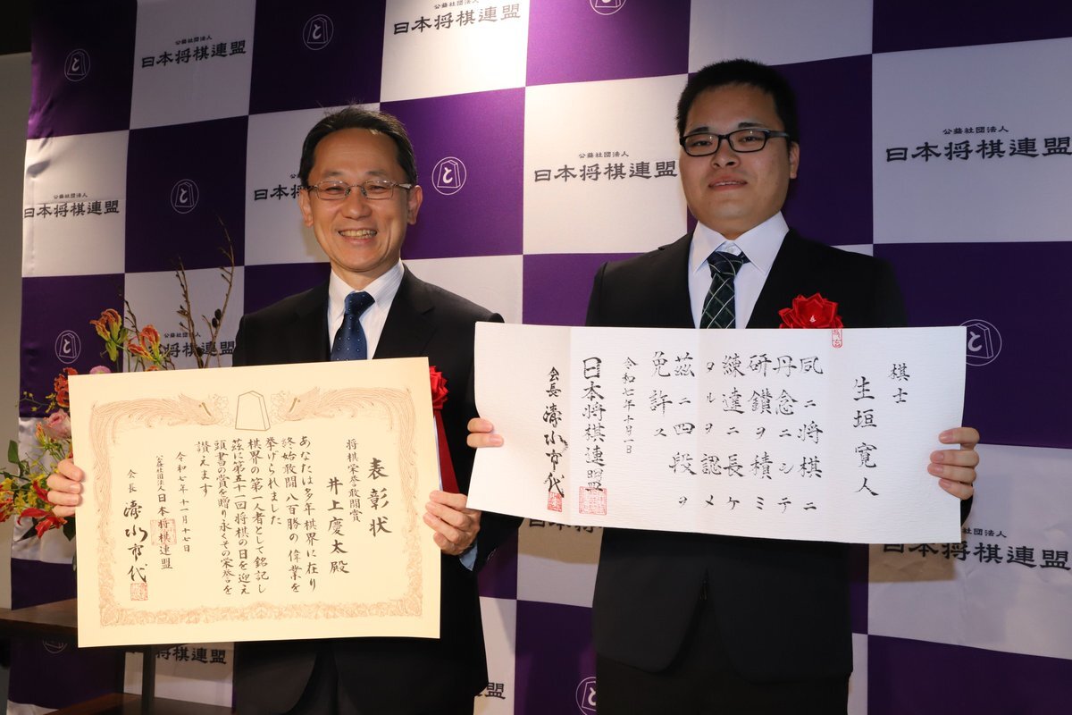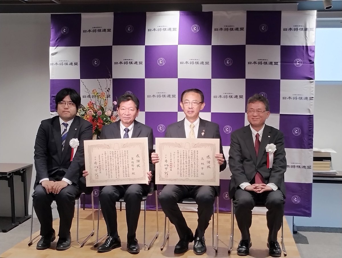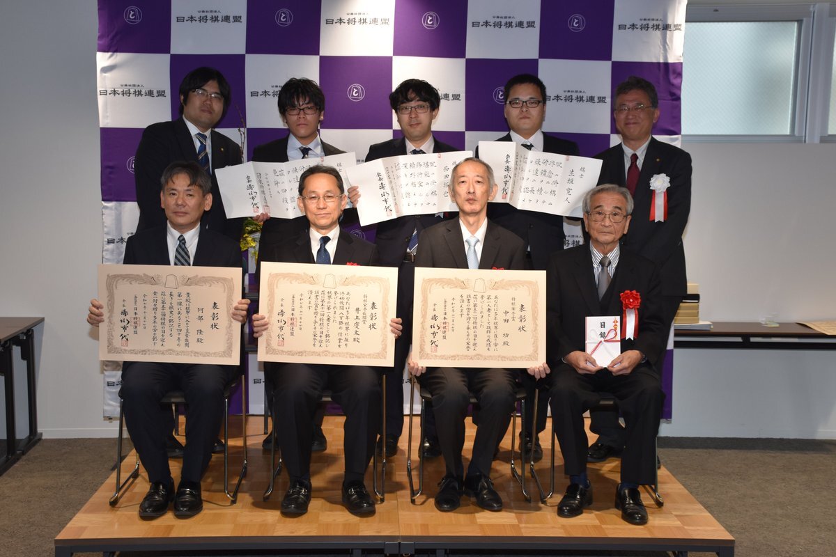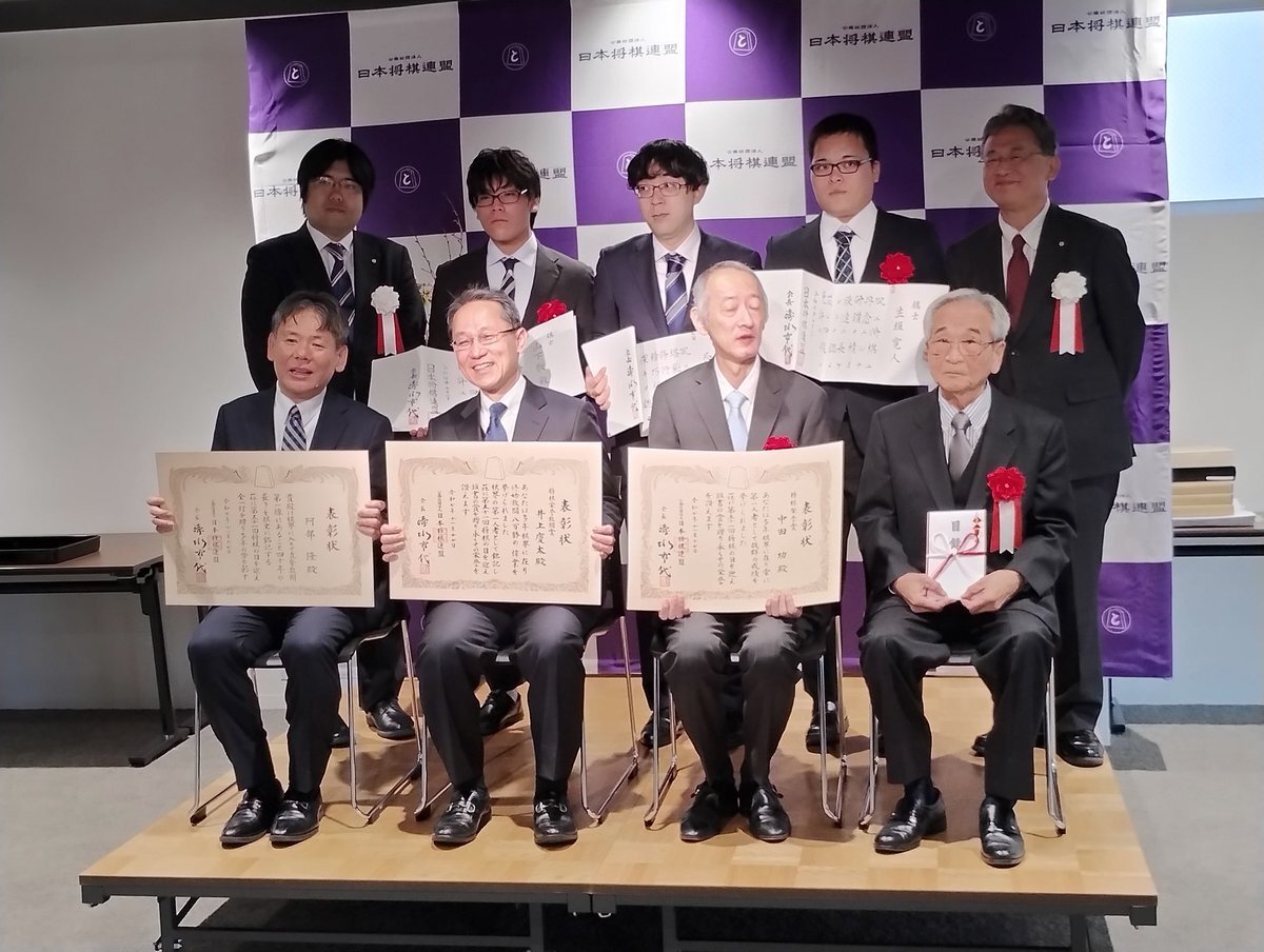 佐〉11月18日(火曜)午前、大阪府高槻市の関西将棋会館では「第51回『将棋の日』表彰・感謝の式典」。左から井上慶太九段=将棋栄誉敢闘賞(800勝)=、中田功八段=将棋栄誉賞(600勝)=、阿部隆九段=勤続40年=。おめでとうございます!