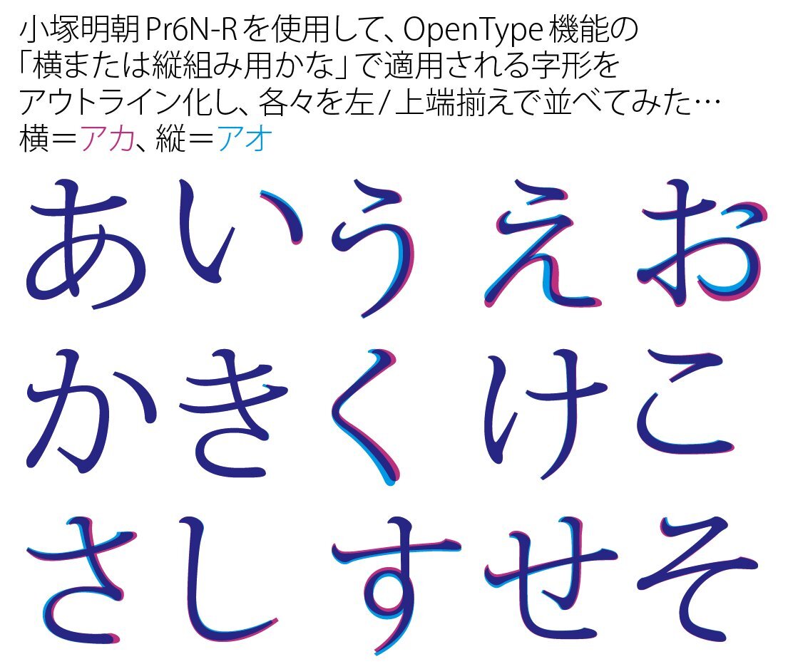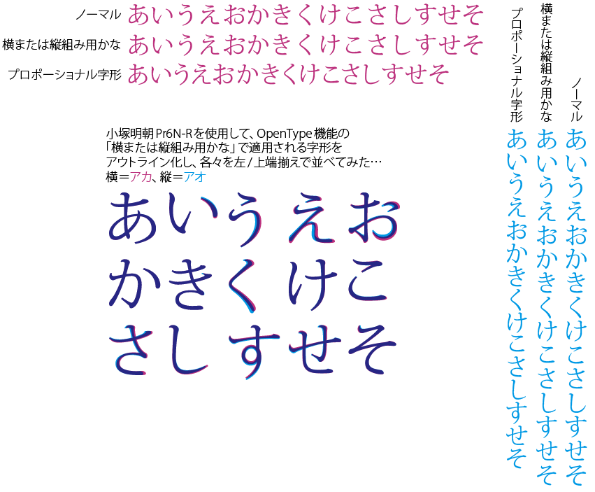 小塚明朝Pr6N-Rを使用して、OpenType機能の 「横または縦組み用かな」で適用される字形を アウトライン化し、各々を左/上端揃えで並べてみた… pic.x.com/3ByPXeiGsK