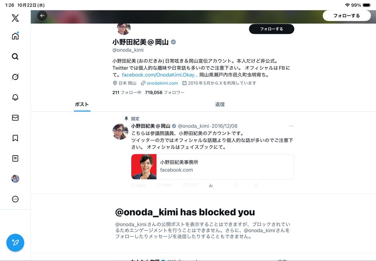たいした実績も経験も無い小野田紀美議員が電撃入閣と聞いて、早速何を発信しているのか調べてみたら、既にブロックされていた😭️ 今まで一度も絡んだ事はなく、倉敷豪雨の際には頻繁に情報発信していて評価すらしていたのに酷いわ…。 ちなみに岡山は母の出身地です。 pic.x.com/1XiejvTXLZ