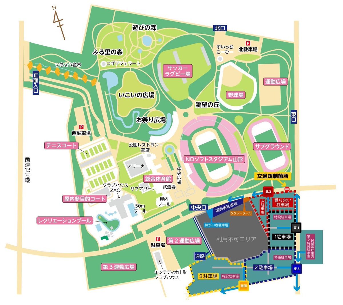 山形県総合運動公園への来場に関するお願い】 新スタジアム建設工事により、特設駐車場のスペースが約半分に縮小しています。 11/29(土)はJ2リーグ最終戦やBリーグの試合開催などで大変混雑が予想されますので、 ご来場の際は ✅公共交通機関のご利用 ✅天童市の臨時駐車場のご活用 など pic.x.com/JCGp0BCzHQ