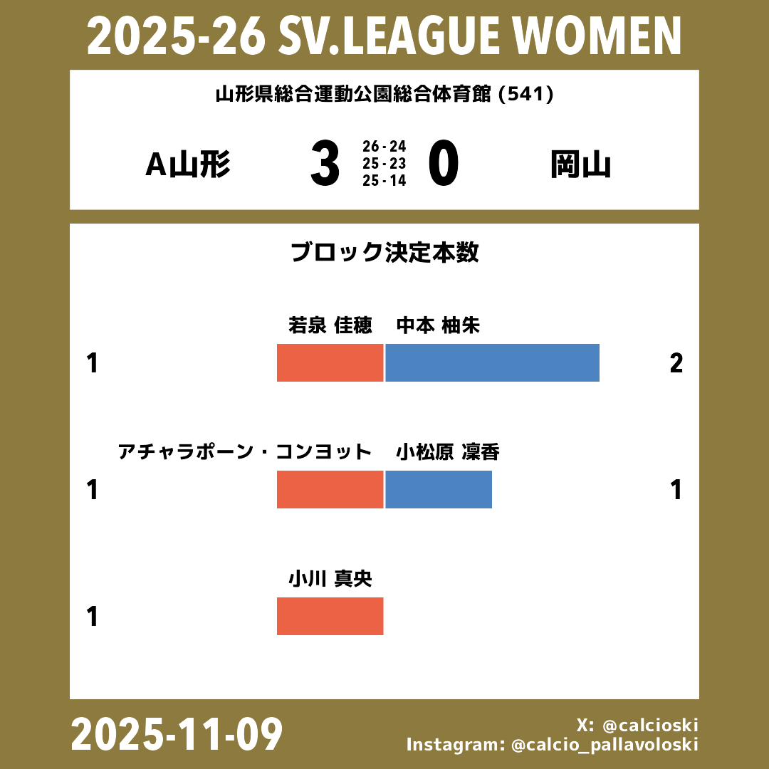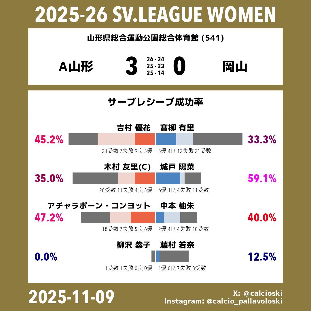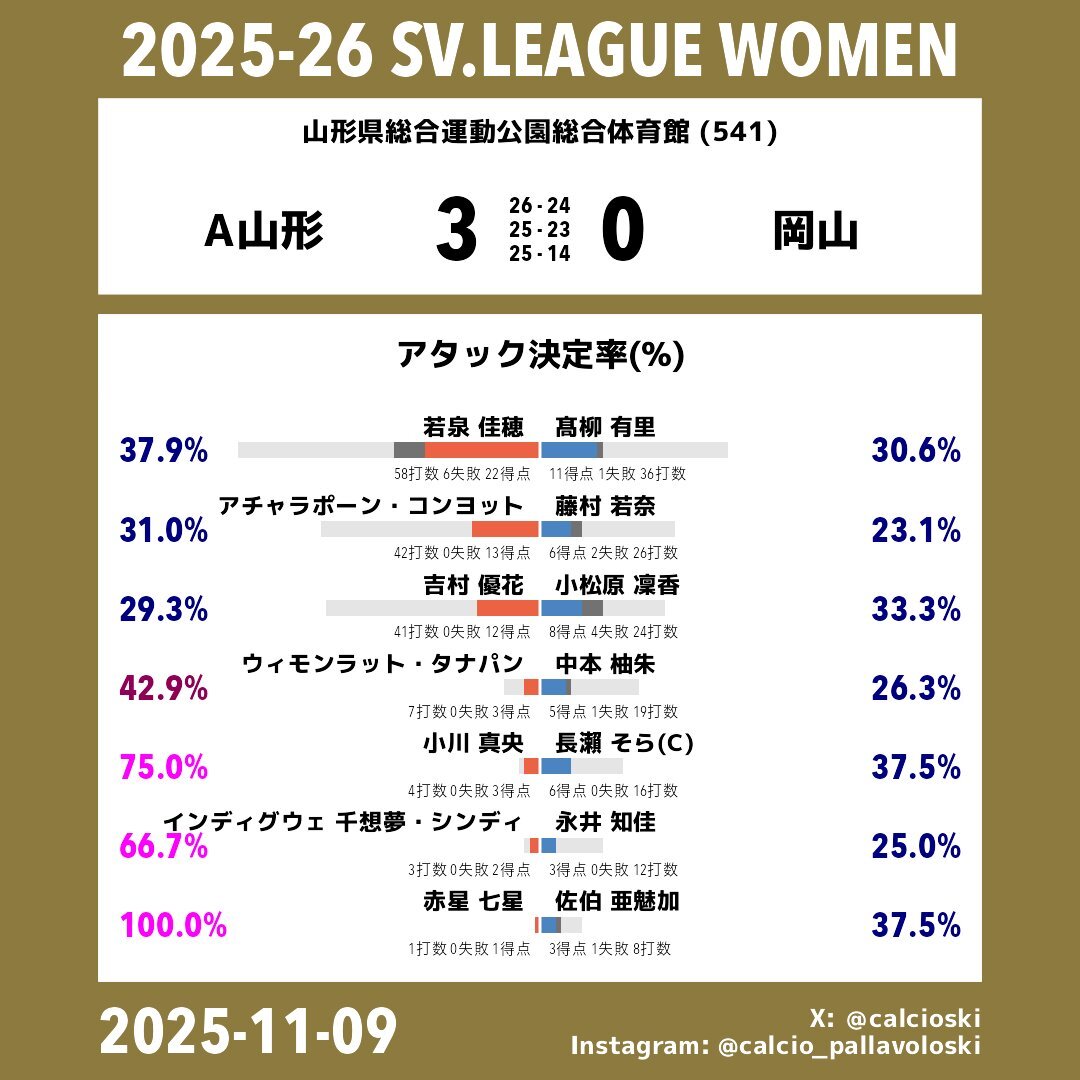 🏐 MATCH RESULT 🏐 2025-26 大同生命SV.LEAGUE WOMEN 📍山形県総合運動公園総合体育館 (入場者数:541) A山形 3-0 岡山 (26-24, 25-23, 25-14) (2/2) 個人成績 pic.x.com/SpgUbsyVuf