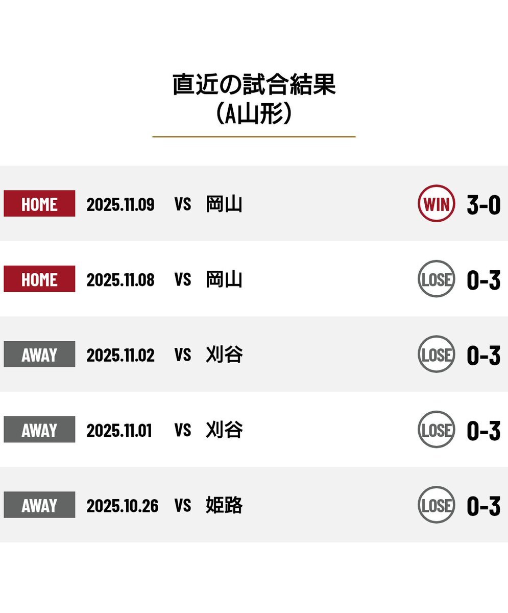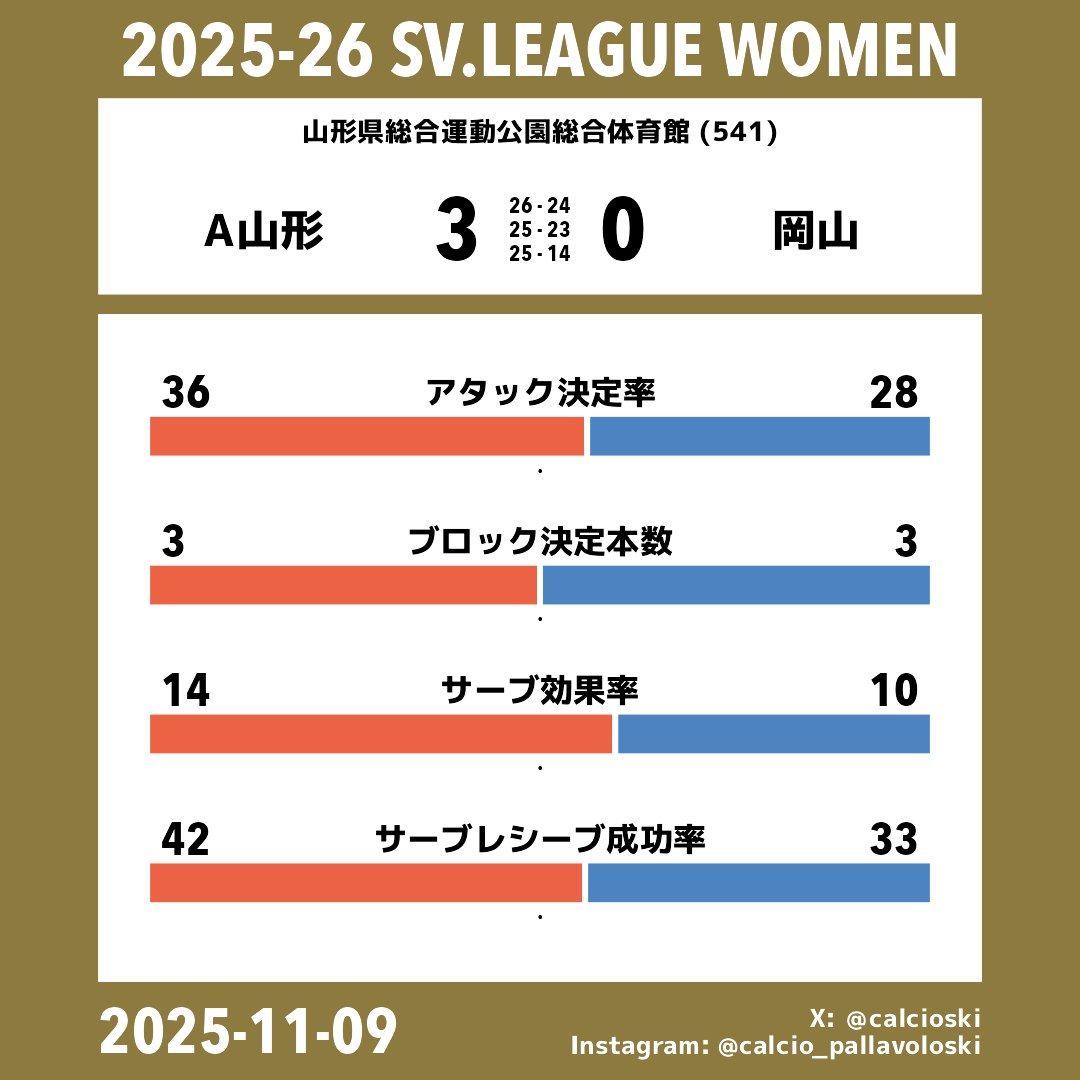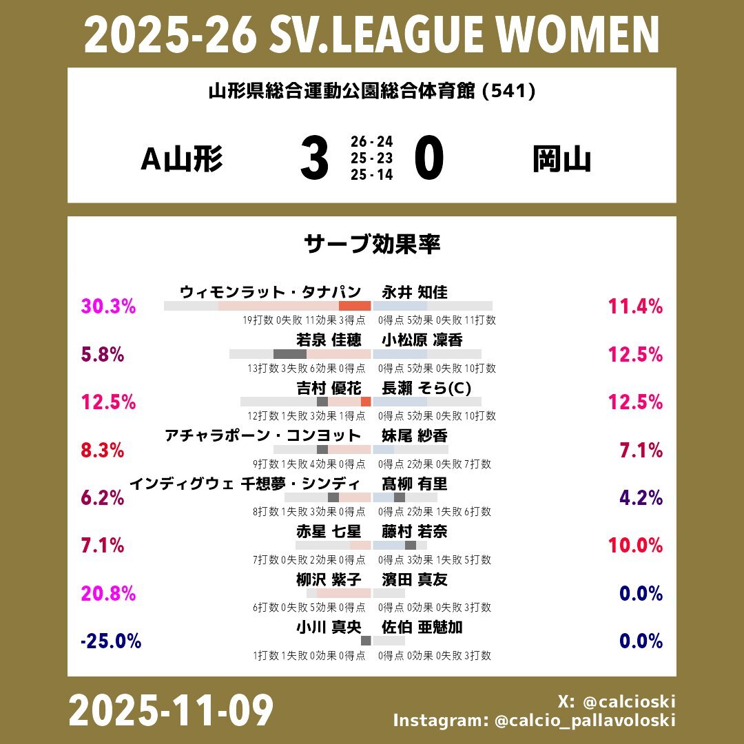 🏐 MATCH RESULT 🏐 2025-26 大同生命SV.LEAGUE WOMEN 📍山形県総合運動公園総合体育館 (入場者数:541) A山形 3-0 岡山 (26-24, 25-23, 25-14) (1/2) チームスタッツ pic.x.com/zUDYmOxHqt