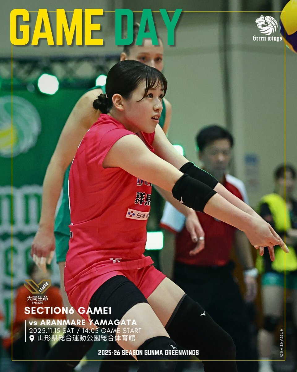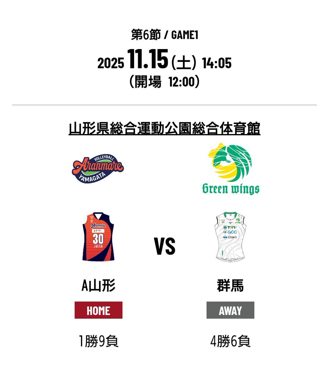 🏐 #大同生命SVリーグ のある週末:11/15(土)🏐 第6節:GAME1は群馬グリーンウイングスさんを迎えてのHOME GAME( #山形県 #天童市 🎪山形県総合運動公園総合体育館)。試合開始は14:05を予定です。 《大同生命SV.LEAGUE公式サイトより》 svleague.jp/ja/match/detai… #アランマーレ山形 #Prologue pic.x.com/xxxCbRUIvI