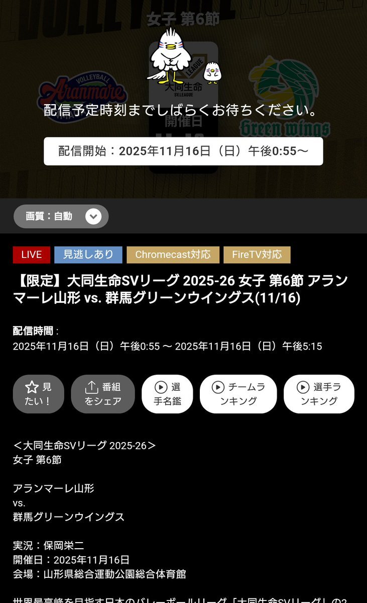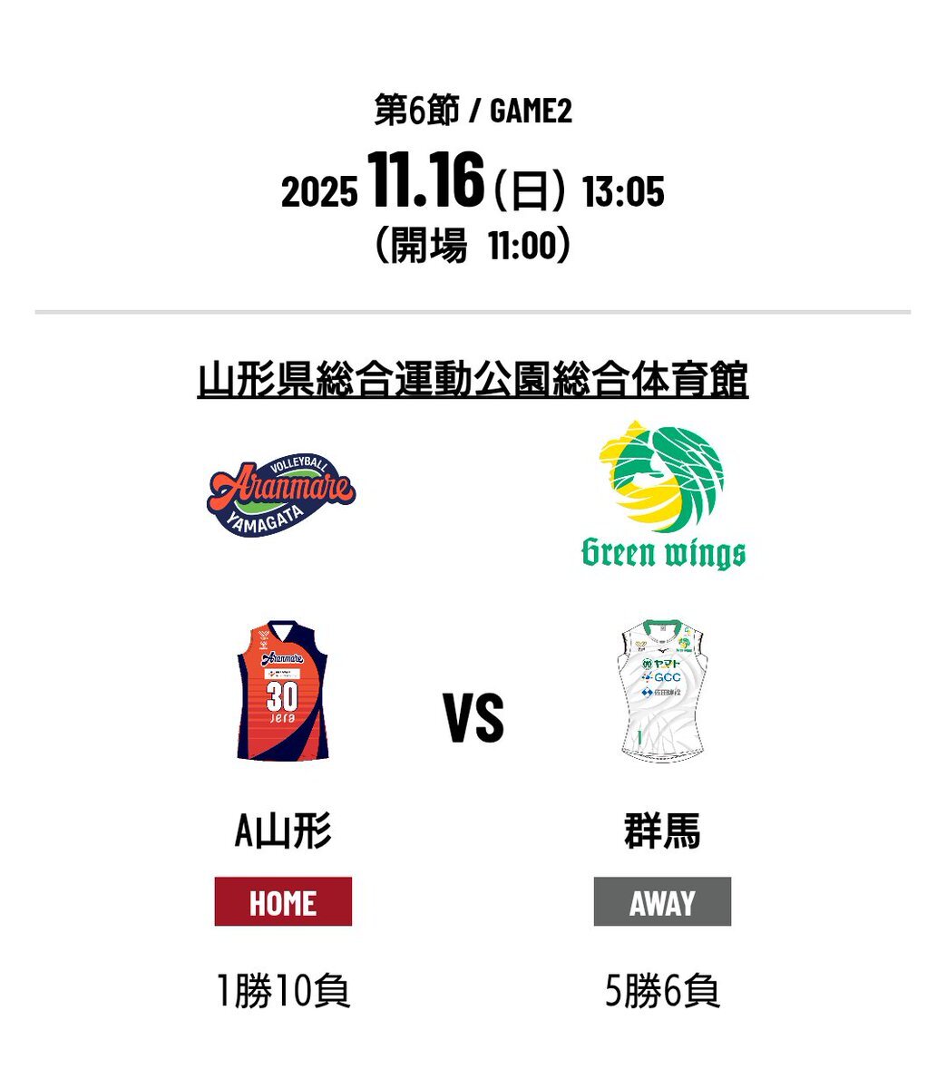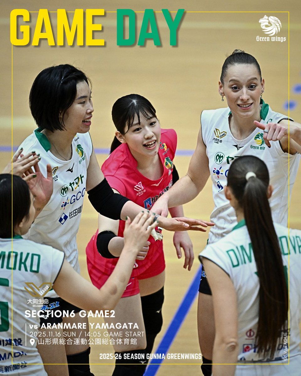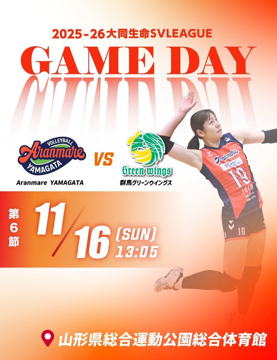 ━━━━━━━━━━━━━ 🍊GAME DAY🍊 2025-26 大同生命SV.LEAGUE ━━━━━━━━━━━━━ 第6節 GAME2 📅11月16日(日) 🕑13:05 試合開始 🆚群馬グリーンウイングス 📍山形県総合運動公園総合体育館 📺J SPORTSオンデマンドでLIVE配信中 pic.x.com/f7tryaJErb