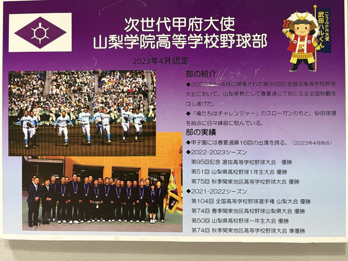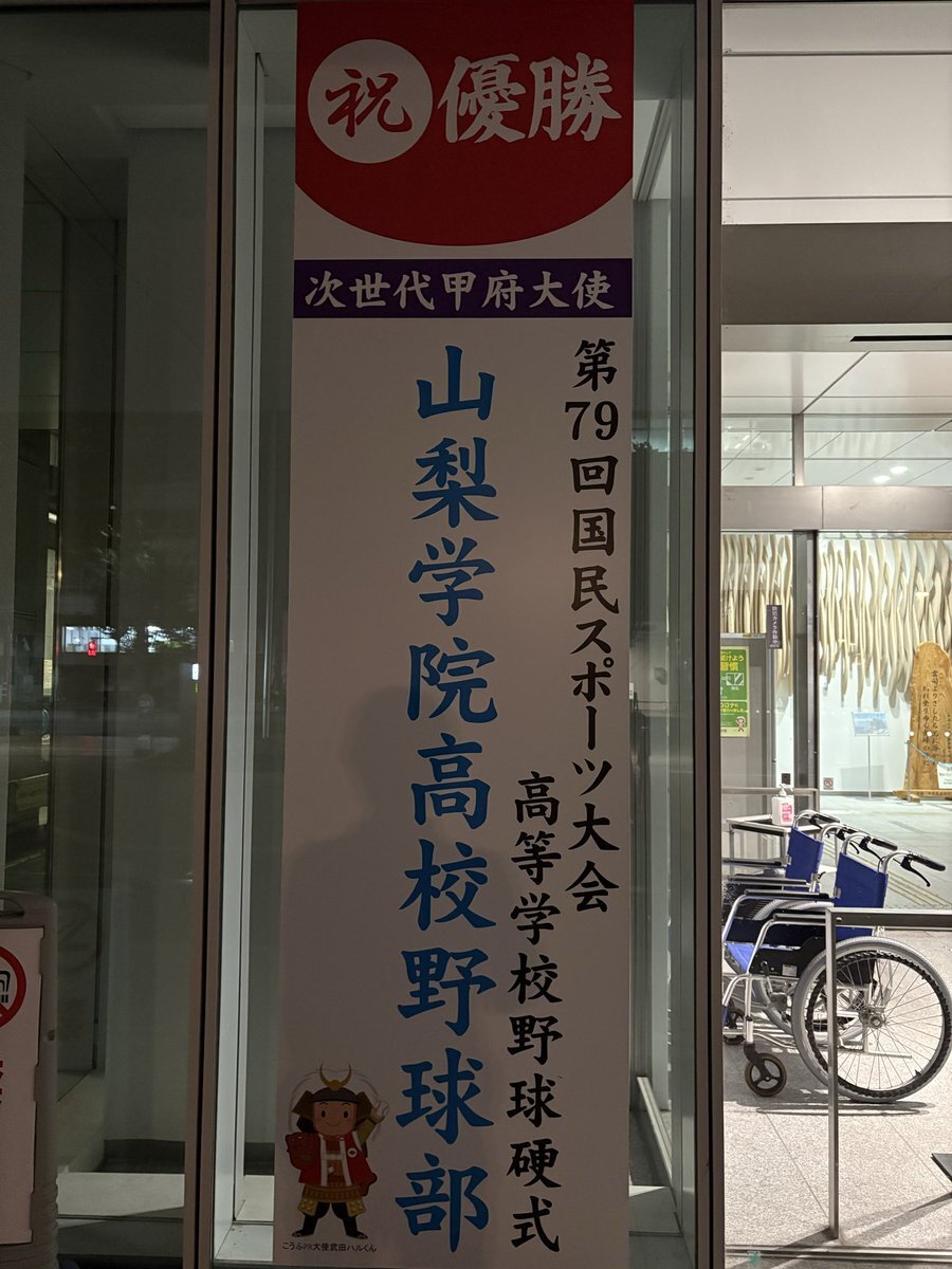 甲府市役所 山梨学院高校野球部 第79回国民スポーツ大会高等学校野球硬式 優勝を讃える垂れ幕が入り口に 次世代甲府大使にも認定され 街をあげて応援されているとのこと 先日の国スポ優勝 また本日の勝利 改めましておめでとうございます pic.x.com/hkI8npq46Y