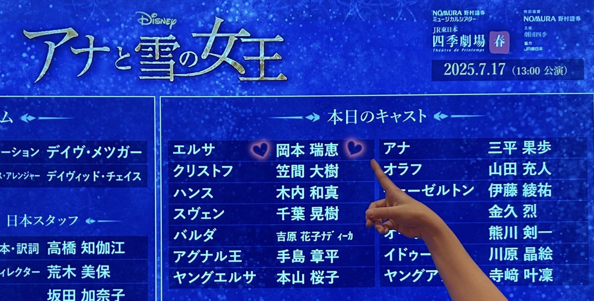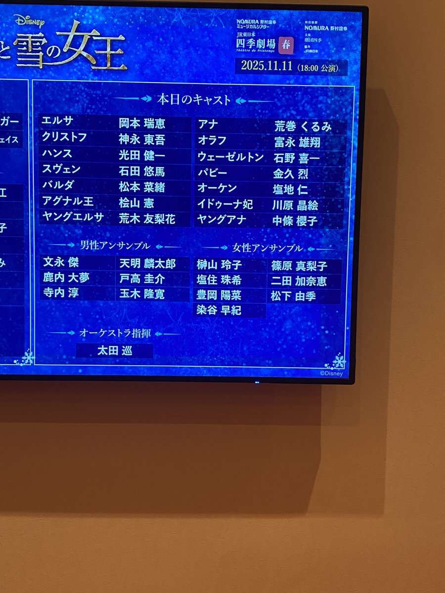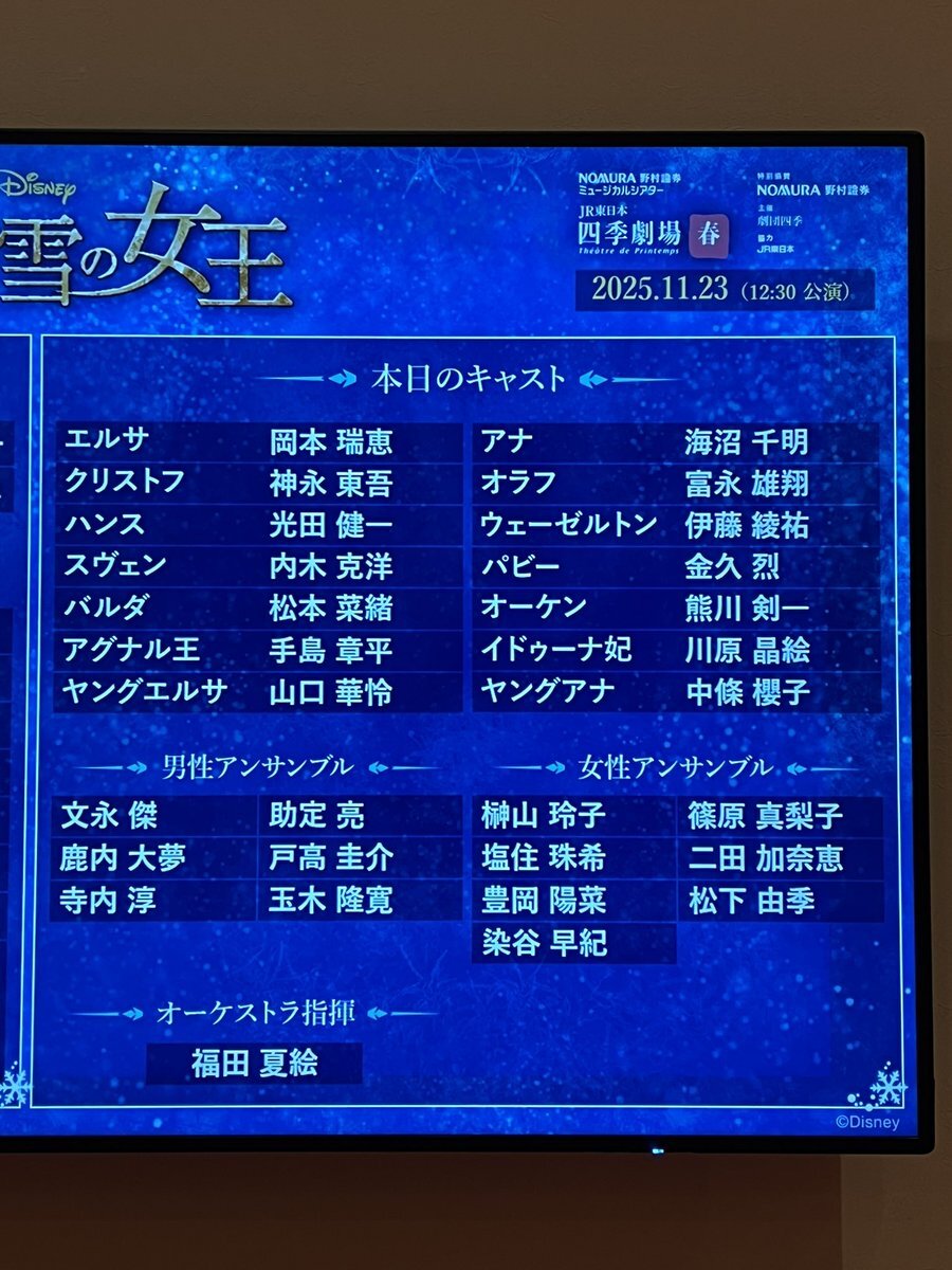 2025.11.23 マチネ アナと雪の女王❄ 勤労感謝の日 ディズニーミュージカル日本上演30周年どうしても仕事でいけないので…🫠 岡本瑞恵さんエルサを観にきました❤️🔥 海沼千明さんアナ久しぶり👋 明日までかなと思うので🎂🎁 指揮者は、福田夏絵さん pic.x.com/8NEpmLABFI