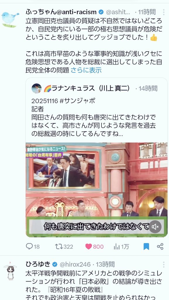 返信先:@sohbunshu誰が悪いかというと、元外務大臣の立憲民主党の岡田克也議員が一番悪いのに決まっています。 中国が最も知りたがっている日本の対台湾の姿勢について、あんなにも根ほり葉ほり聞くのは国会議員としては常軌を逸しています 一方で高市首相は過去の発言の範囲内で真摯にお答えしており好感が持てる