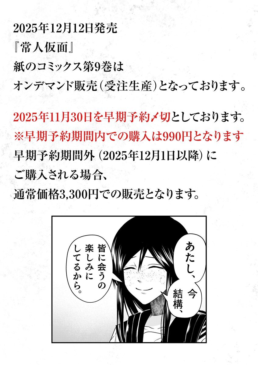 【常人仮面9巻予約開始‼️】 オンデマンド版予約開始しております!! 今月末(11/30)までとなりますので、お求めの方はお早めにお願いいたします! また電子版もよろしくお願い致します!🙏✨ #常人仮面