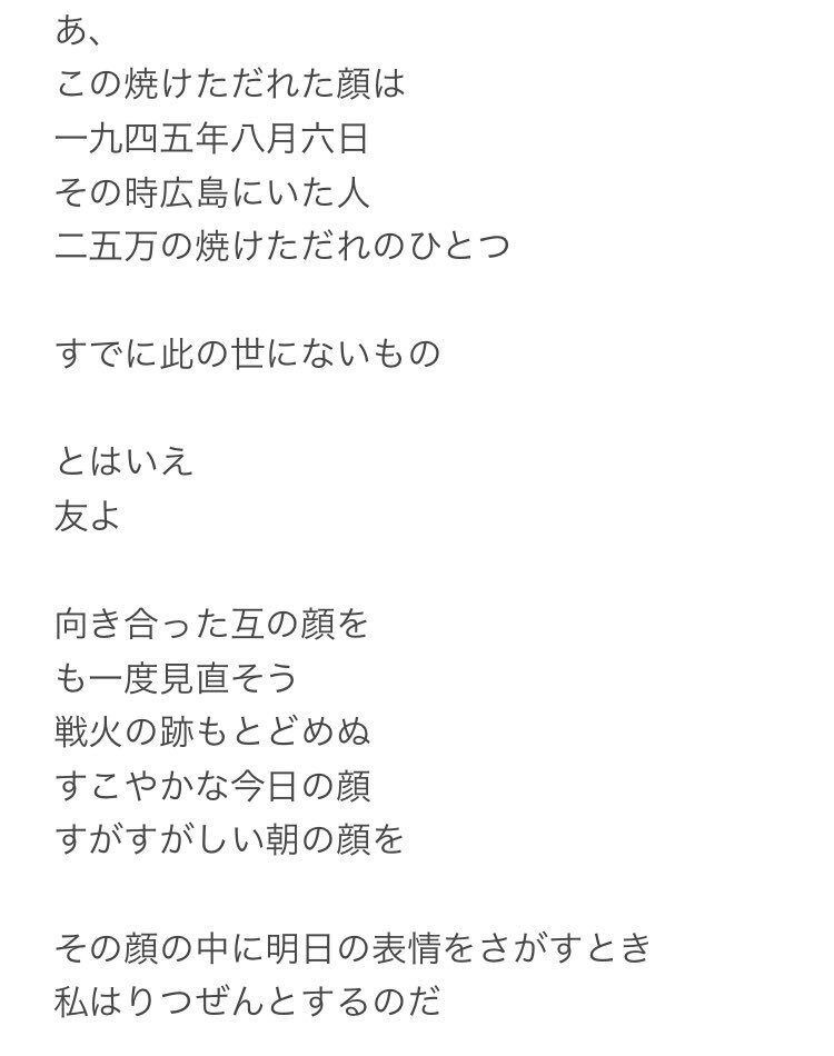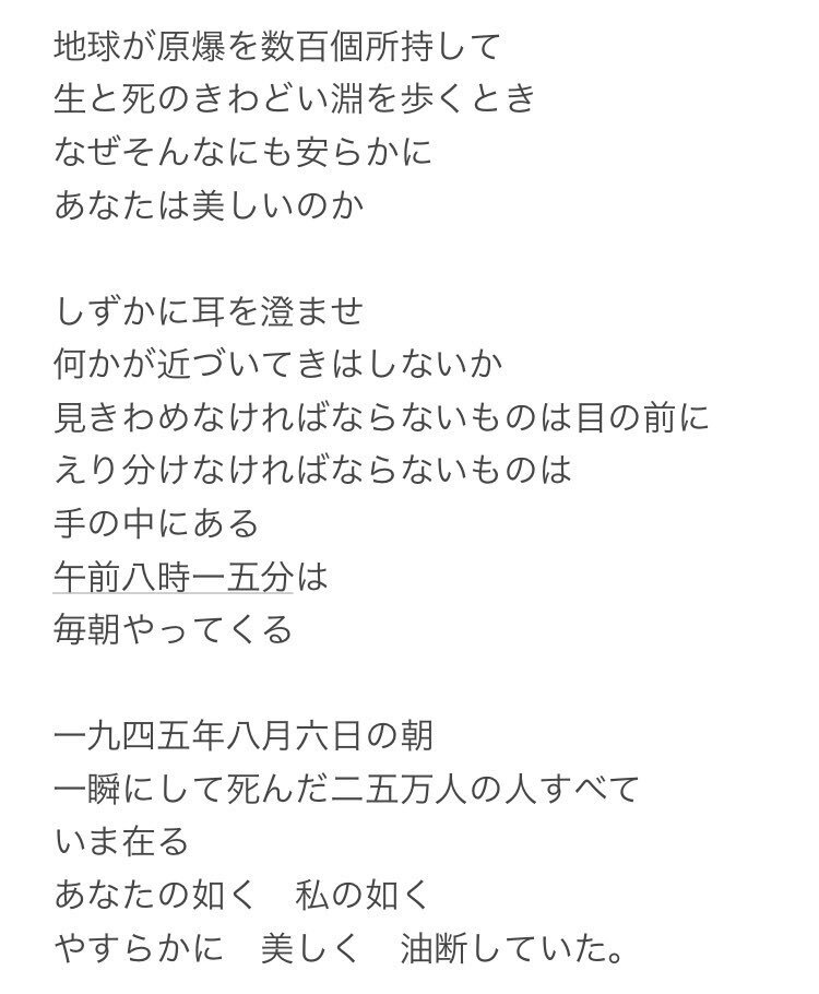 8月6日は、広島原爆の日(広島平和記念日)。 多くの人に読んでほしい、石垣りんの詩「挨拶 原爆の写真によせて」。 (参照:『ユーモアの鎖国』ちくま文庫、 P186~188) pic.x.com/RxKfLIga5E