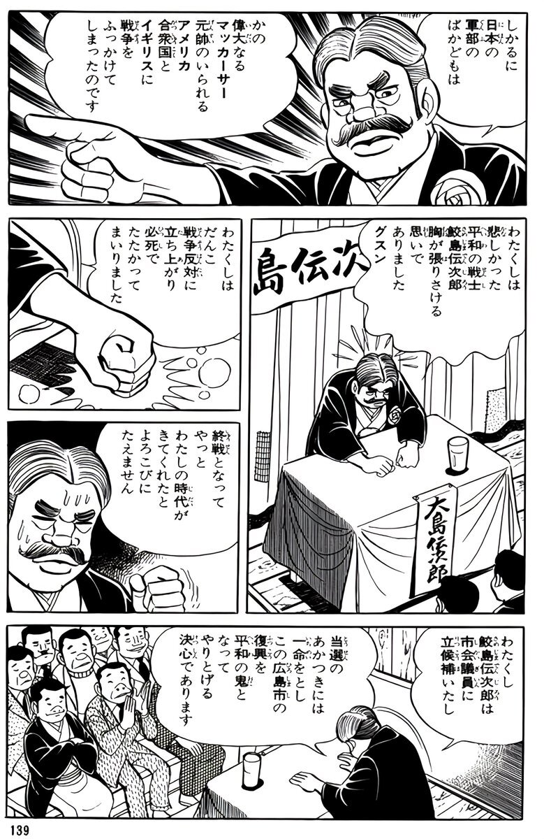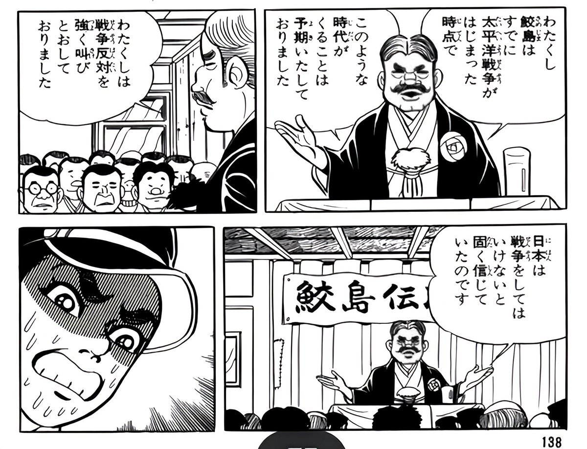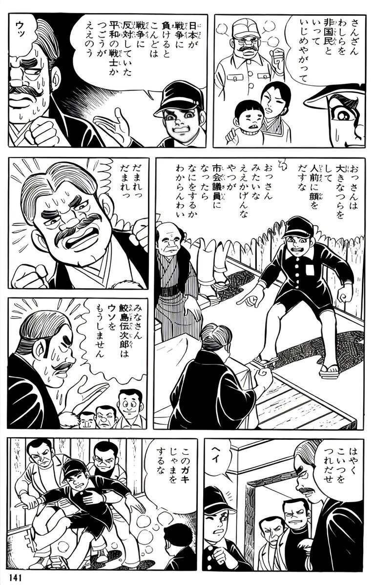 「はだしのゲン」の鮫島伝次郎。戦前は、 戦争に反対する人々を非国民と呼び、戦争に批判的な人々を叩きまくる模範的な皇国臣民だった。 だが、日本が戦争に敗けた途端に、 何食わぬ顔で平和運動家に鞍替えした。 日本がまた戦争に敗けたら、ネトウヨもこうなる。 #広島平和記念日 #はだしのゲン pic.x.com/eAgfcJq2Iw x.com/kiji_nuko/stat…