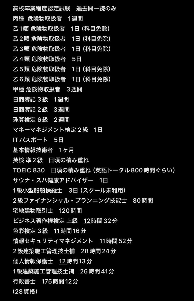 今年合格の資格。今回の行政書士で28個目 4月 ・障害者手帳3級() 初診日より6ヶ月 5月 ・情報セキュリティマネジメント 11時間52分 6月 ・2級建築施工管理技士補 28時間24分 ・個人情報保護士 12時間13分 7月 ・1級建築施工管理技士補 26時間41分 11月 ・行政書士 175時間12分 pic.x.com/2QB9gE0KXI