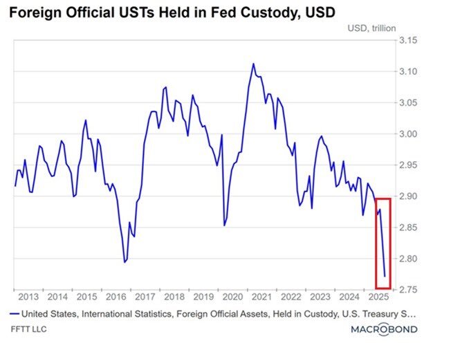 BREAKING: Foreign official US Treasuries held in Fed custody fell to $2.78 trillion in October, the lowest since 2012. These are Treasury securities held by foreign governments, central banks, and other official international institutions through accounts at the Fed. Foreign