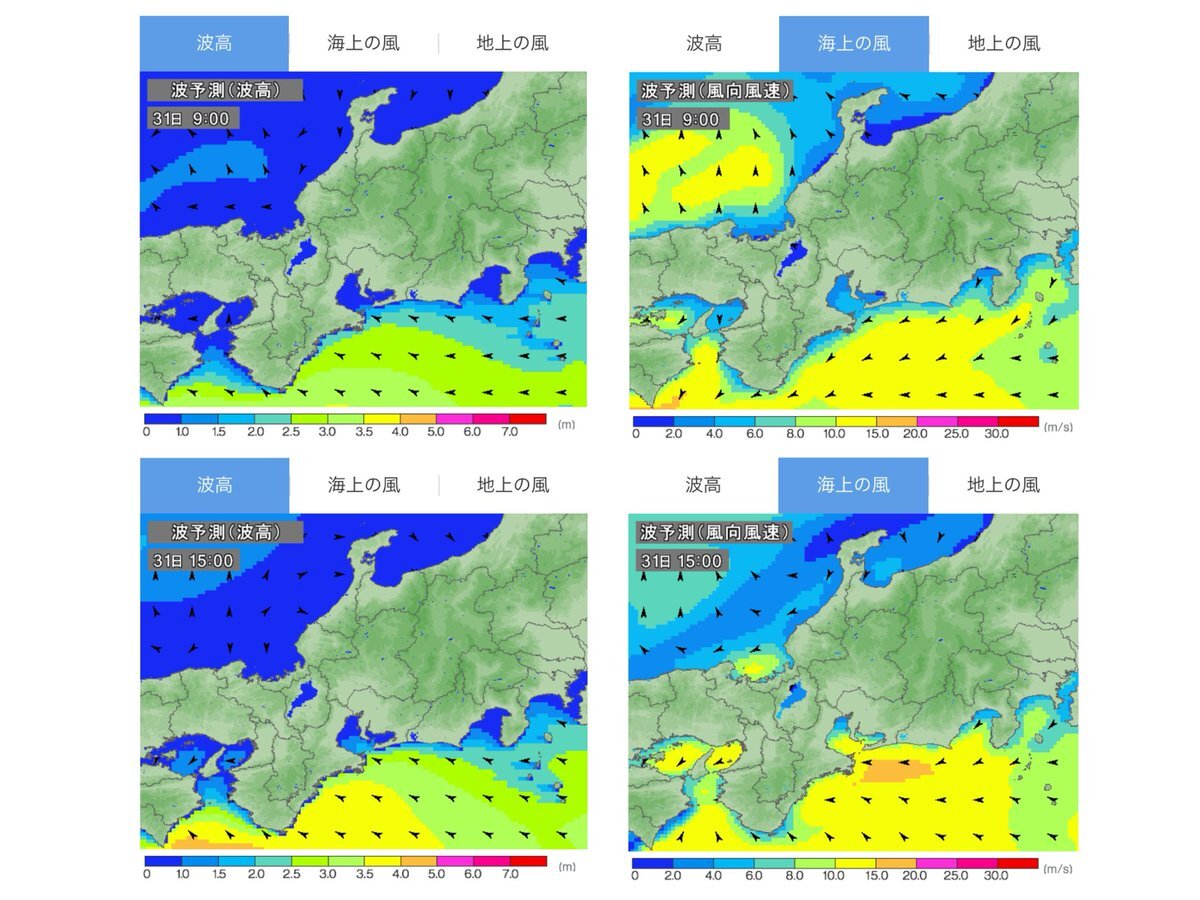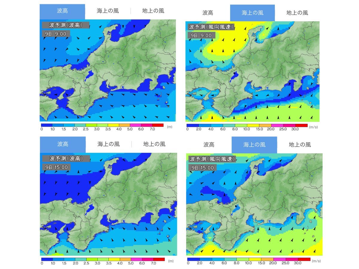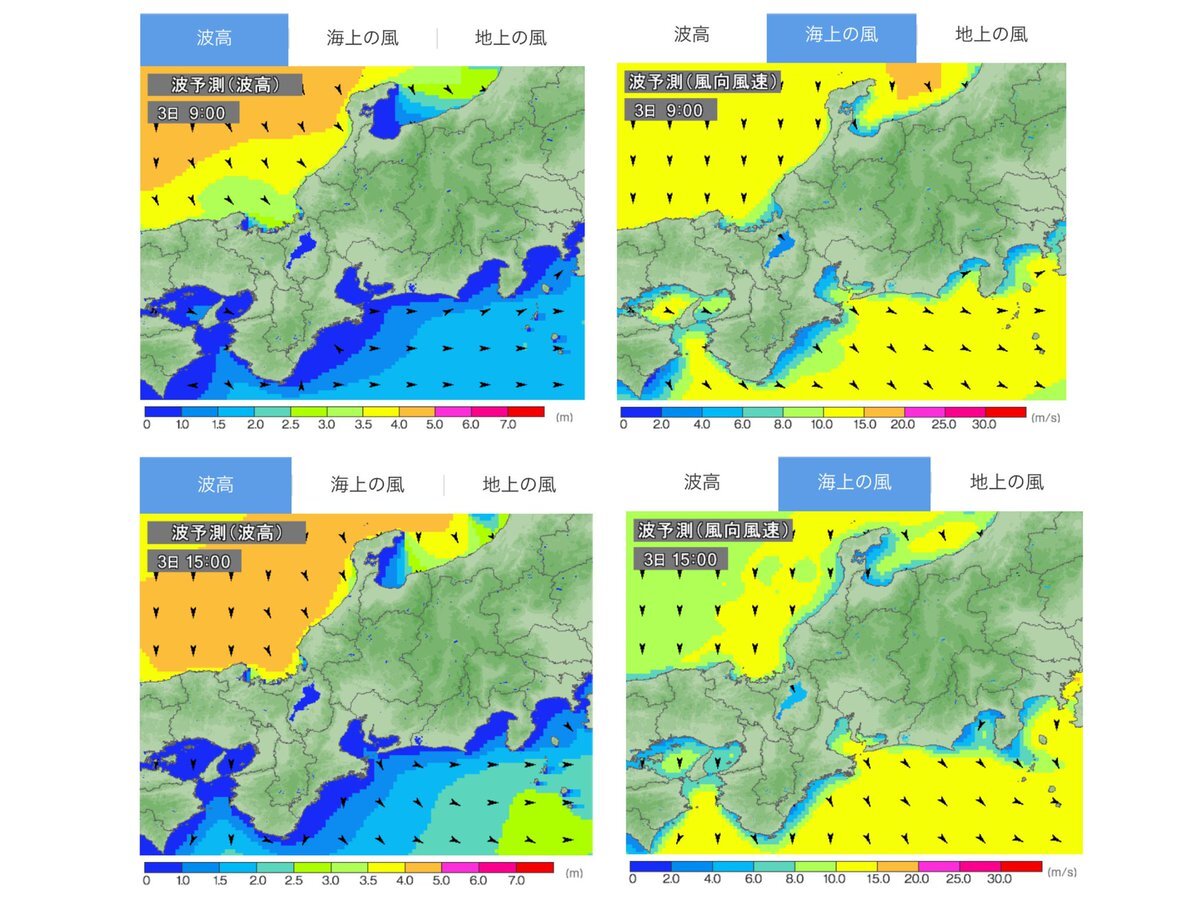 きょうの #友ヶ島汽船⛴ 荒天のため全便欠航_φ(・_・ 今日わは運航時間帯の風速6-8m、海上では北の風強く、波2m後1.5m。⚠️強風注意報発令。13時台が風8mでピーク。これは完全アウト、全便欠航です🎯 海上の風の図が広範囲で黄色ですね。案内無いけど当然クルーズも欠航でしょう。 pic.x.com/4IPFrCPlxl