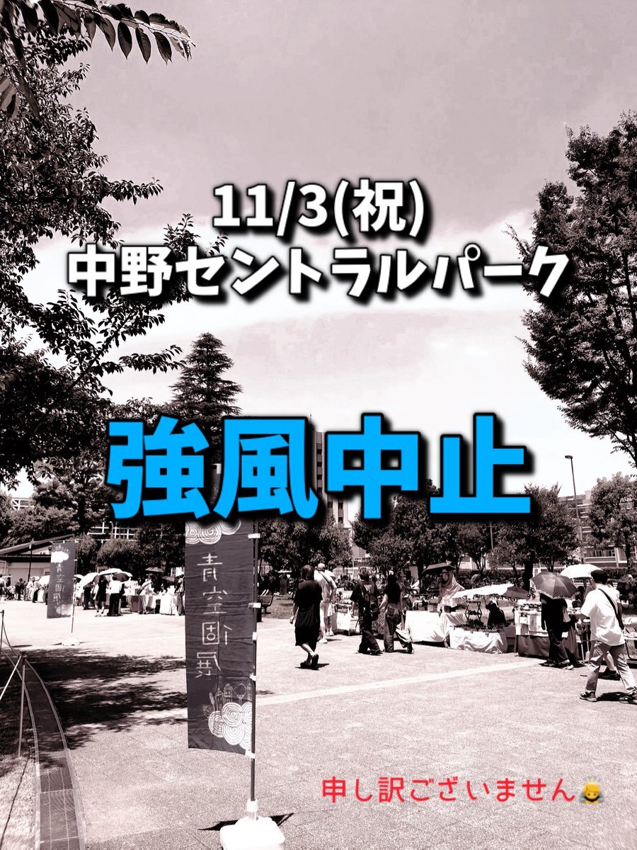 〈強風中止のご案内〉 11/3(祝)本日予定しておりました【中野セントラルパーク手作り市】はお昼過ぎから風速7m以上の予報と中野区に強風注意報⚠️が発令している為、安全面を第一に考え中止とさせて頂きます。 お楽しみにされた方、大変申し訳ございませんが、何卒ご理解の程宜しくお願い致します🙇 pic.x.com/AEsckFLOFu