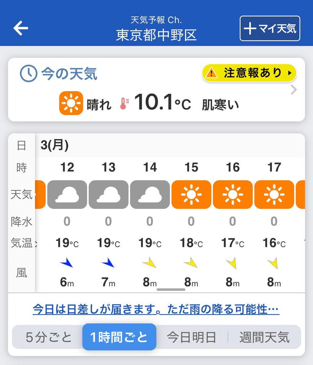 #快晴 陽射も北風冷たい日 #大気不安定 #雷注意報,#強風注意報 等 最低気温:10.6℃/04:49 最高気温:19.4℃/11:26 最大瞬間風速:17.7m/s北西/13:43 (東京都心今のところ) 14時で17.1℃,7.3m/s北西,湿度:39%,気圧:1016.7hPa #マイあさ#イマソラ #今日の空 #今日の雲 #今日の烏 #今日の鷺 #今日の鴨 pic.x.com/NZ6Z5EDMsD