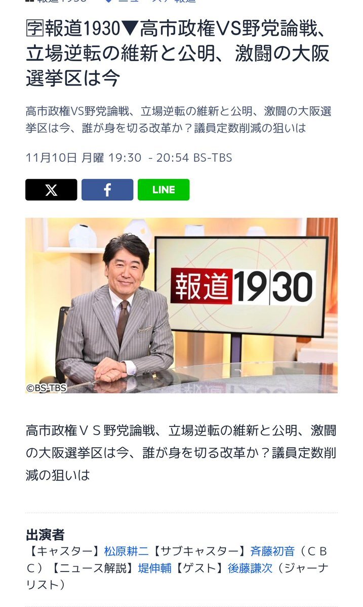 本日10日の19:30〜21:00 BS-TBS 報道1930に出演します。 (ゲスト) 山田宏(自民党参議院議員)/ 後藤謙次(ジャーナリスト)/ 佐藤千矢子(毎日新聞専門編集委員) ぜひご覧ください。 share.google/dIse9BjkyK35Gb…