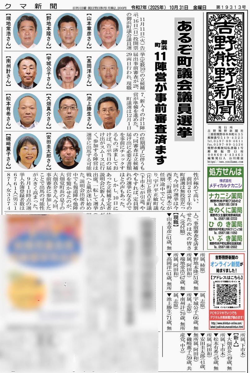 あるぞ町議会議員選挙! #御浜町 11陣営が事前審査済ます 2025.10.31日付ONLINE購読している #ヨシクマ新聞 さん記事をお借りして (いつもありがとうございますm(__)m) 11月11日(火)告示 11月16日(日)当開票 の #御浜町議会議員選挙🗳️見込みついて ご報告させていただきます🫡 pic.x.com/4vPPDvMgpA