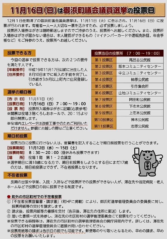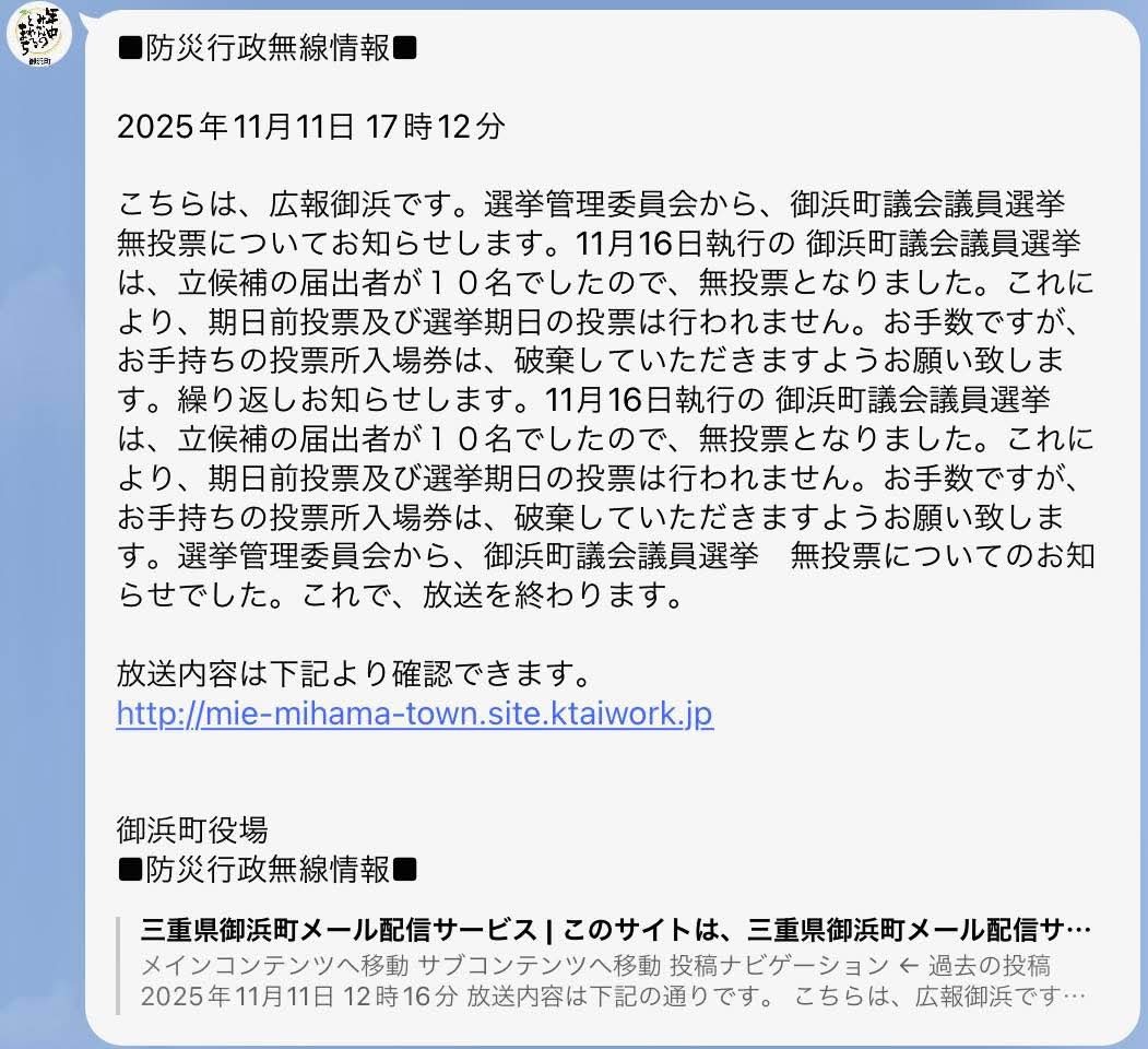 2025年11月11日 17時12分 こちらは、広報御浜です。選挙管理委員会から、御浜町議会議員選挙 無投票についてお知らせします。11月16日執行の 御浜町(・・・以下リンク先で) #御浜町 mihama-musen.seesaa.net