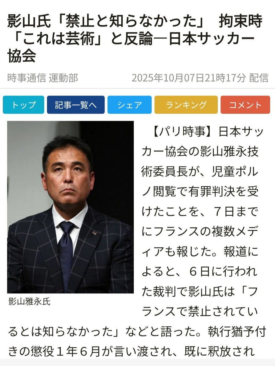 JFA影山雅永技術委員長がフランスで逮捕、 飛行機内で児童ポルノ画像の輸入・所持の容疑。 懲役18カ月、フランス領土への入国禁止10年、 未成年者に関わる業務従事禁止10年、 性犯罪者名簿への登録が科された。 sponichi.co.jp/soccer/news/20…