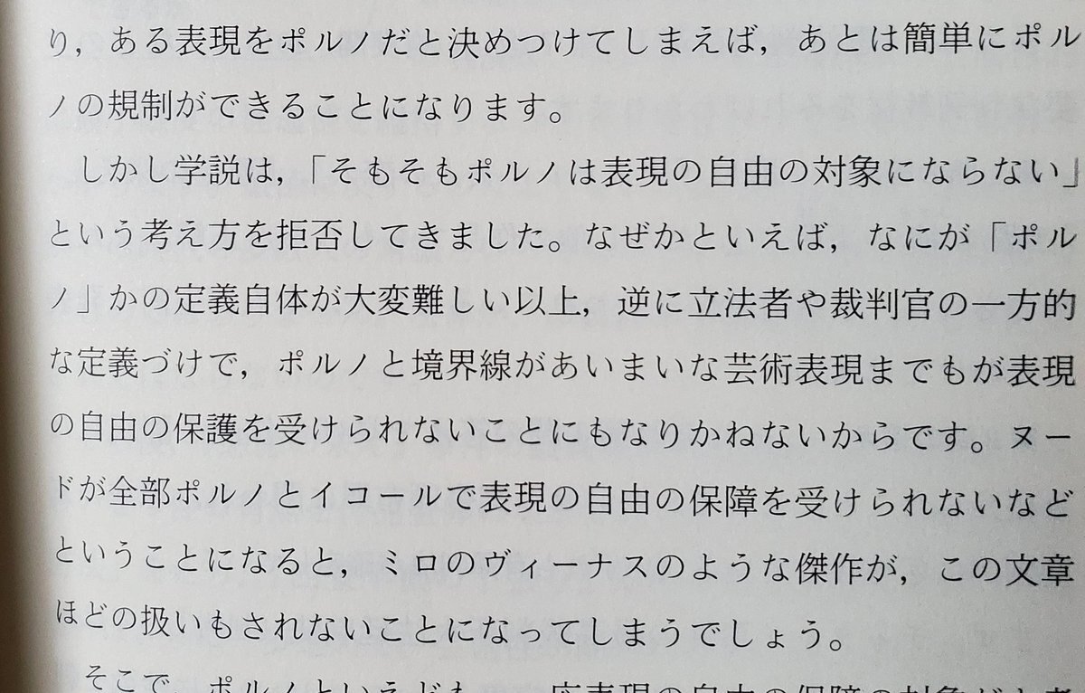 “ポルノ表現は表現の自由に含まれないが、ミロのヴィーナスを作って見せる自由は芸術表現だから表現の自由に含まれ、後者だけが憲法21条1項で保障される”というような考え方を、憲法学説は、これまで拒絶してきました 初宿正典ほか著『いちばんやさしい憲法入門第6版』(有斐閣、2020)87頁〔棟居快行〕 pic.x.com/29lqHQW9Gm