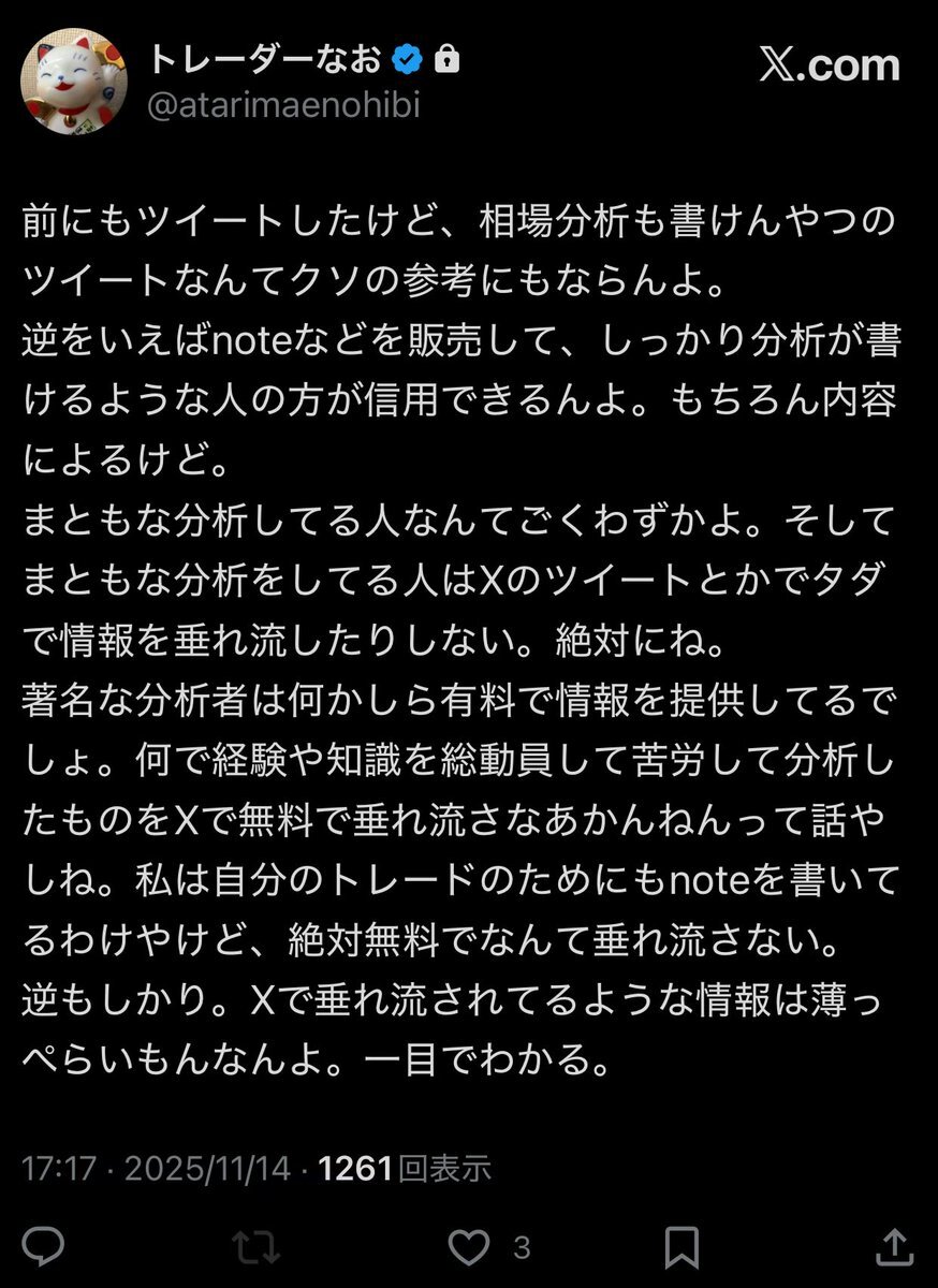 一般的な投資家なら有益な分析を有料で売らず自分だけで使ってボロ儲けするだろ。 著名な分析者は分析を商売にしていて投資家とは別の職業だろ。しかも証券口座作ればだいたい無料でレポート読めるし。 #トレーダーなお pic.x.com/aTYvIHEh9A