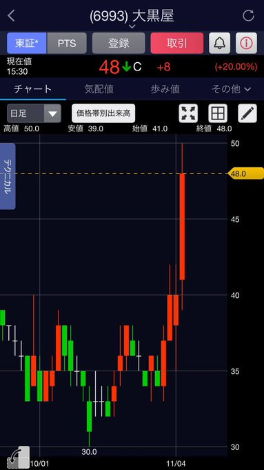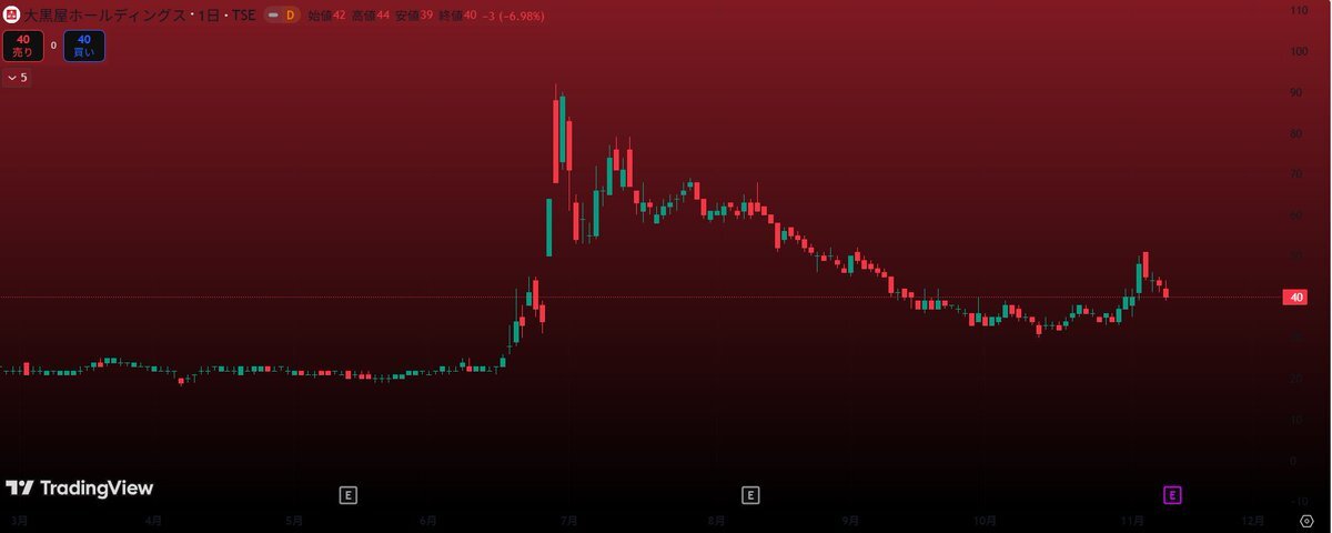 今すぐ仕込みなさい。 大黒屋HD(6993) 現在株価は40円 明らかに今が底値。キオクシア、ソフトバンクG、JX金属を保有している方は今すぐ乗り換えを検討しなさい。私の予想ではこの #日本株 は【4桁】までぶっ飛びますよ。皆さんも4万円から100万を狙えます。 必ず「イイネ/ブクマ」で保存すること。 x.com/koba_stock99/s…
