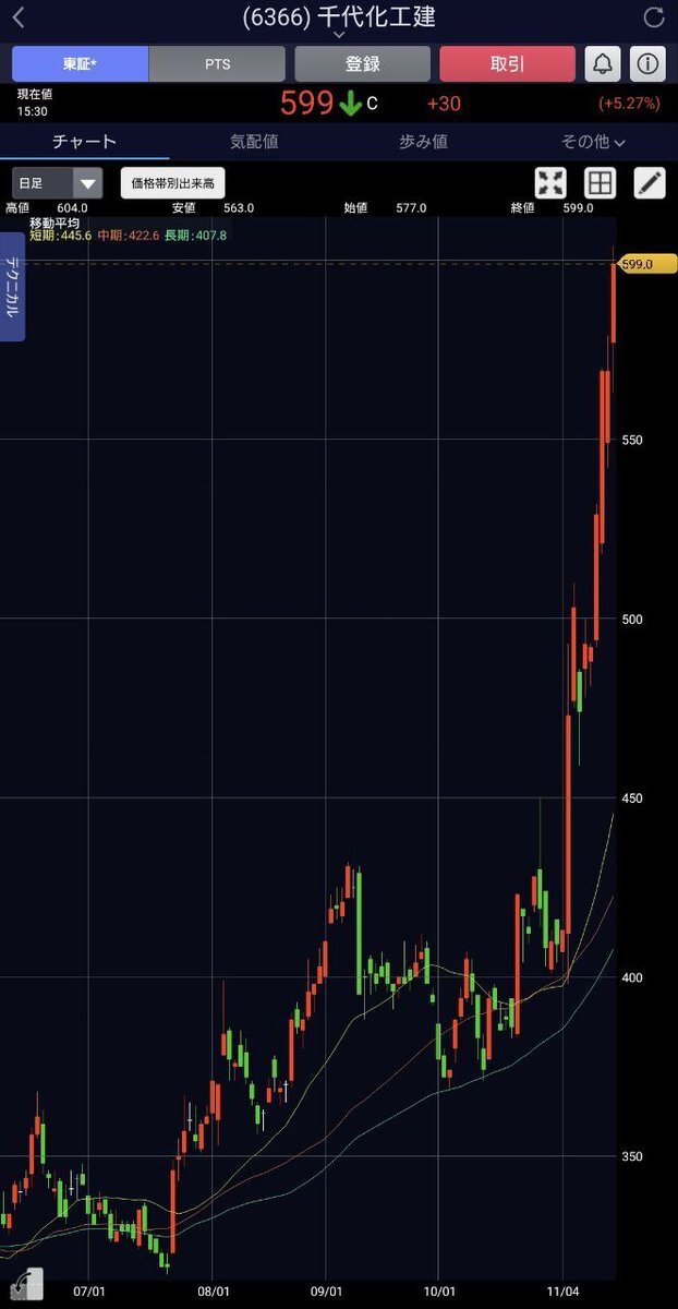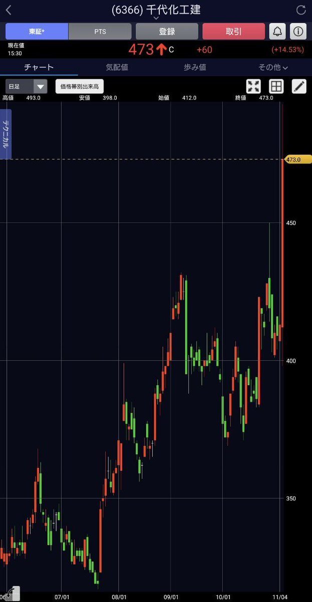 はい、これが私が勝ってる証明 《6366 千代田化工建設》 株価409円→473円(本日ストップ高) 上がると確信して紹介してから "たった2日で+15.64%" 日本株って簡単ですね笑 x.com/traderjapanyug…