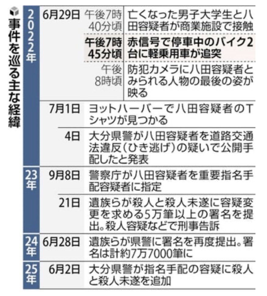 #大分県 #別府市 令和4年6月29日 信号待ちのバイクに車で故意に加速し時速約100Kmで追突 男子大学生2人死傷 逃走 殺人と殺人未遂(時効なし),道路交通法違反 重要指名手配 八田與一(よいち)容疑者(28)大分県 #日出町 大分県警と愛知県警は名古屋駅で情報提供呼び掛けpref.oita.jp/site/keisatu/k… #八田與一 pic.x.com/whjQw5NPMB
