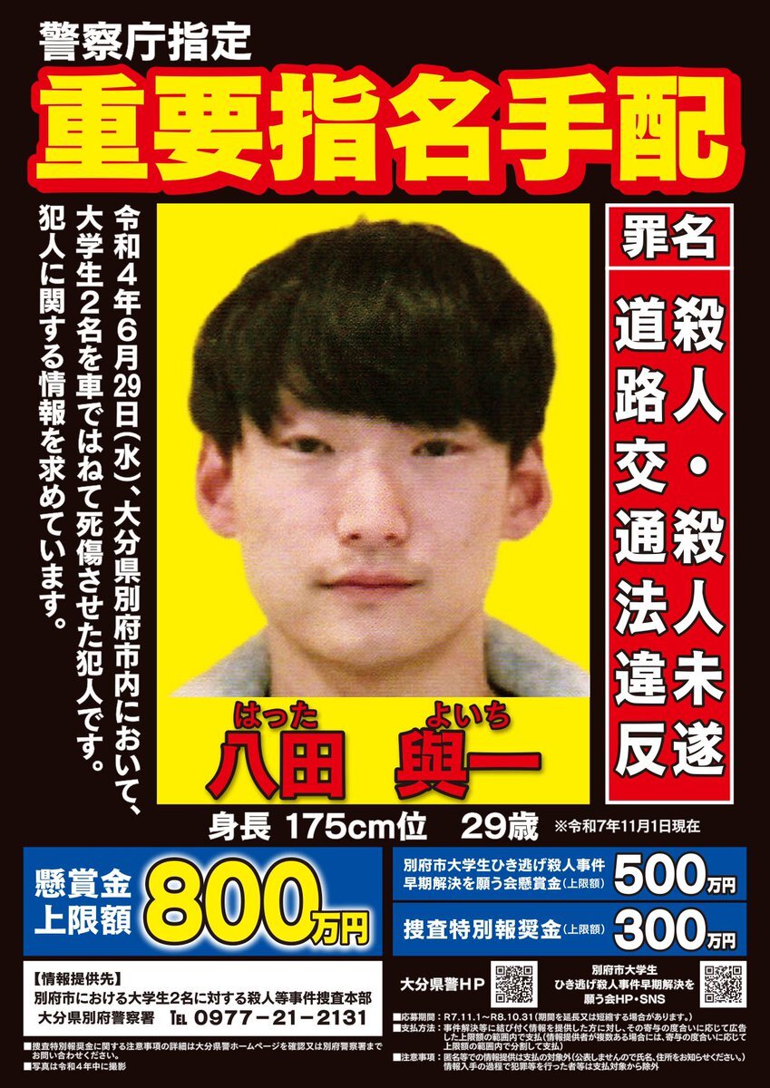 【警察庁指定重要指名手配被疑者 八田與一】 別府市において発生した大学生2名に対する殺人等事件の指名手配犯八田與一の情報を求めています。あなたの街に現れるかもしれません。この顔を見たらすぐに通報!別府警察署(0977-21-2131) #大分県警察 #指名手配 #別府願う会 #八田與一 pic.x.com/pbpcRsmJi3