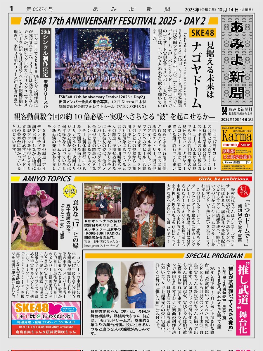 「SKE48 17th Anniversary Festival 2025」開催!36thシングル発売と新ユニット企画、オリジナル新公演制作決定、舞台「推しが武道館いってくれたら死ぬ」上演など発表多数!! | WWSチャンネル wws-channel.com/girls2/583826.…