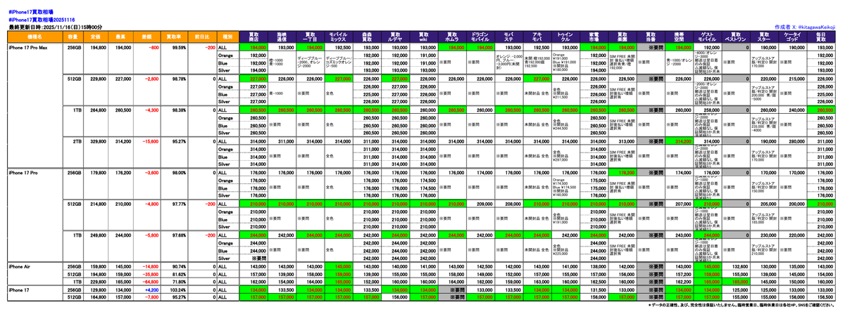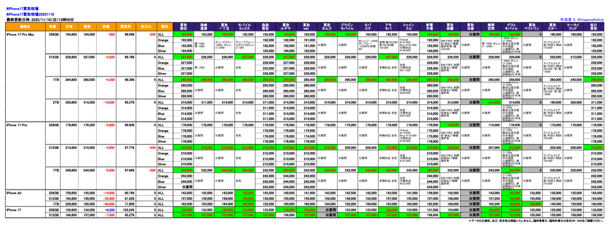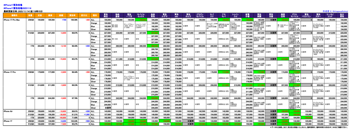 #iPhone17買取相場 #iPhone17買取相場20251114 最終更新日時:2025/11/14(金)19時00分 📱iPhone 17 Pro Max 256GB: 195,500 💰利益: +700(100.36%) 📈前日比: -200 ┗ 🏪モバイルミックス,アキモバ,家電市場,買取楽園,携帯空間 📱iPhone 17 Pro Max 512GB: 227,500 💰利益: pic.x.com/QZtAHbRxuo