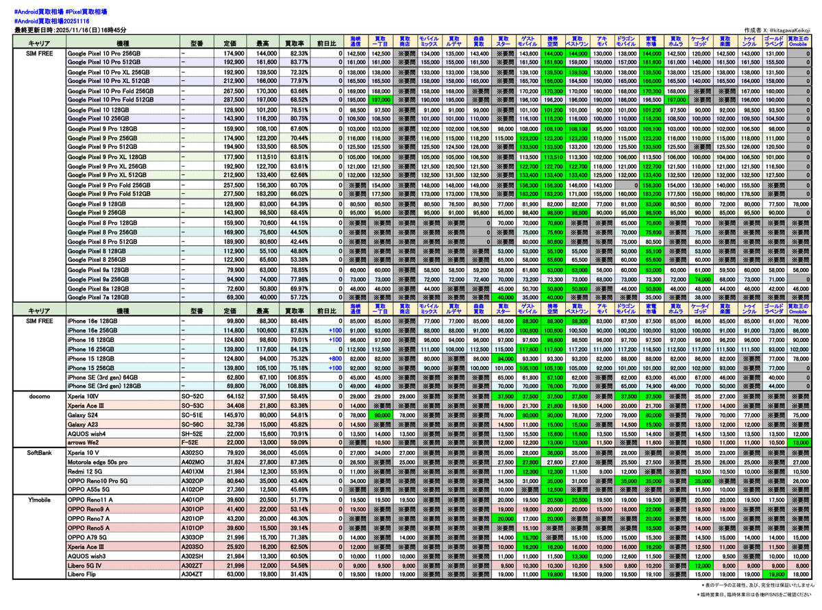 #Android買取相場 #Pixel買取相場 #Android買取相場20251116 最終更新日時:2025/11/16(日)16時45分 Google Pixel 10 Pro 256GB:144,000 (前日比: +0) ┗ 携帯空間,買取ベストワン,家電市場 Google Pixel 10 Pro 512GB:161,600 (前日比: +0) ┗ 携帯空間,家電市場 Google Pixel 10 Pro XL pic.x.com/2U8xV66Qjt