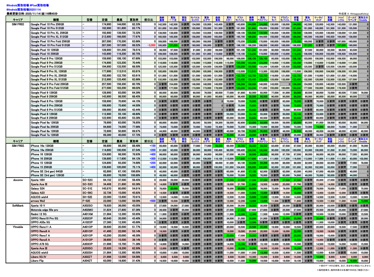 #Android買取相場 #Pixel買取相場 #Android買取相場20251114 最終更新日時:2025/11/14(金)16時45分 Google Pixel 10 Pro 256GB:144,000 (前日比: +0) ┗ 携帯空間,買取ベストワン,家電市場 Google Pixel 10 Pro 512GB:161,600 (前日比: +0) ┗ 携帯空間,家電市場 Google Pixel 10 Pro XL pic.x.com/uYO1ZVB0fS