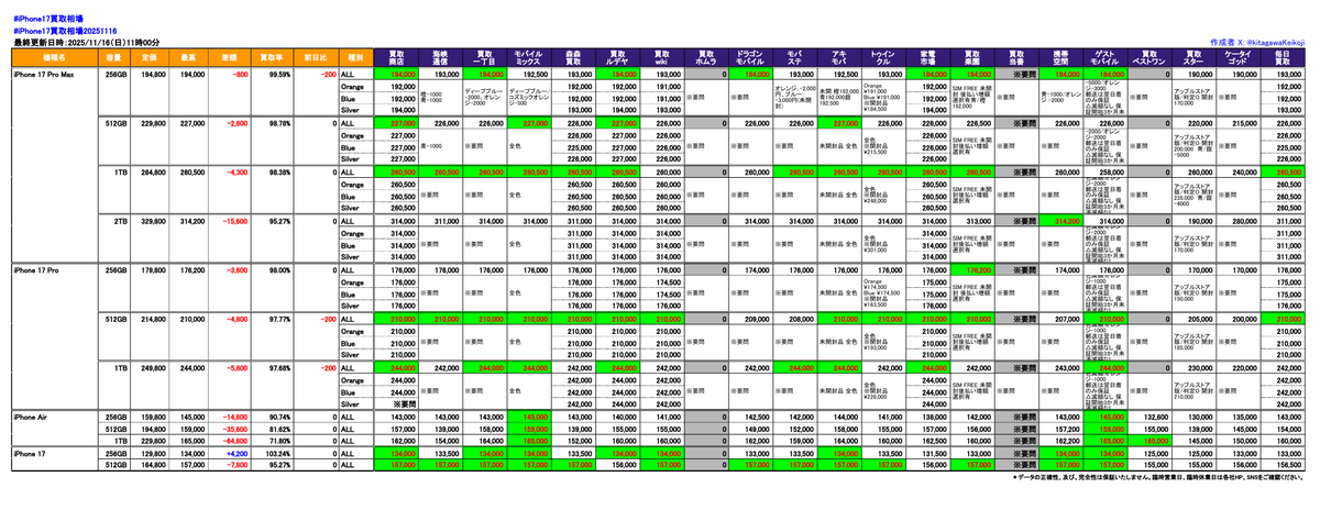 #iPhone17買取相場 #iPhone17買取相場20251116 最終更新日時:2025/11/16(日)11時00分 📱iPhone 17 Pro Max 256GB: 194,000 💰利益: -800(99.59%) 📈前日比: -200 ┗ 🏪買取商店,買取一丁目,買取ルデヤ,ドラゴンモバイル,家電市場,買取楽園,携帯空間,ゲストモバイル 📱iPhone 17 Pro Max pic.x.com/7ProuKWqal