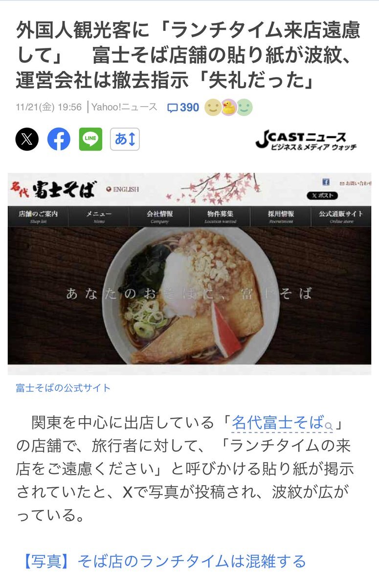 別に富士そばは悪くないのでは。通常営業だよ 外国人観光客に「ランチタイム来店遠慮して」 富士そば店舗の貼り紙が波紋、運営会社は撤去指示「失礼だった」(J-CASTニュース) #Yahooニュース news.yahoo.co.jp/articles/d581d…