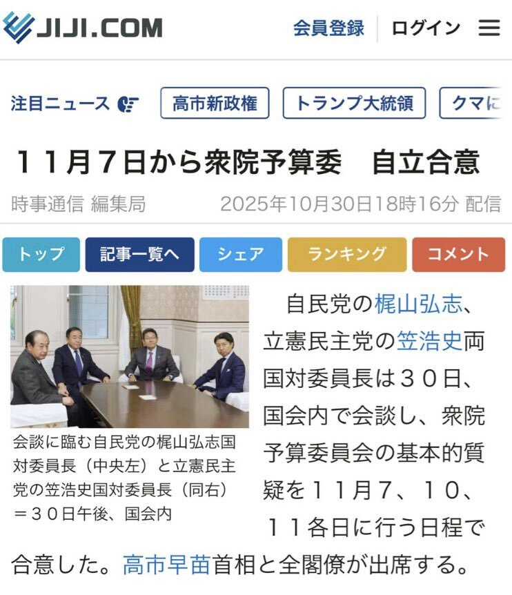 逆になんで撤回しないといけないんだ? #支持率下げてやる 通信社? 高市首相、存立危機発言撤回せず 黒字目標「来年1月指示」―予算委:時事ドットコム jiji.com/jc/article?k=2… @jijicomより