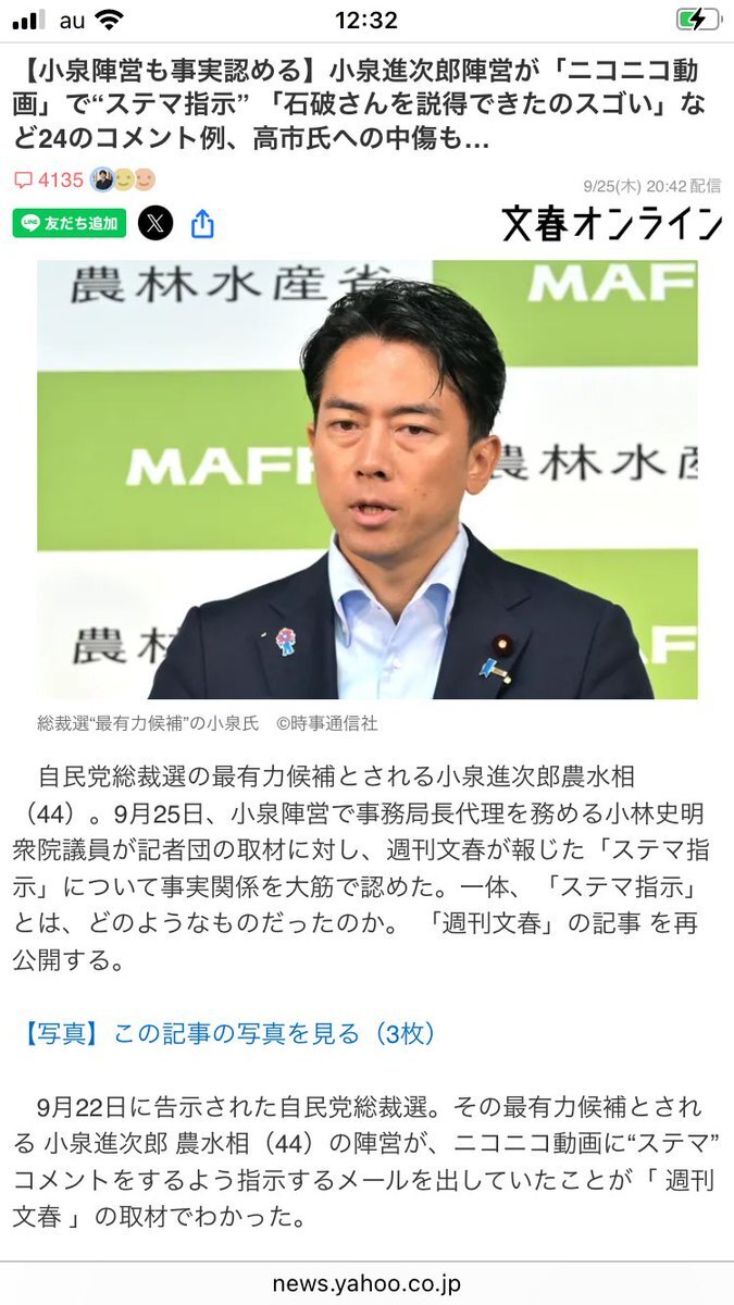 小泉陣営も事実認める 小泉進次郎陣営が「ニコニコ動画」で“ステマ指示” 「石破さんを説得できたのスゴい」等のコメント例、高市氏への中傷も…との事🤷一年前のコココの自民総裁選出馬表明を今年のと間違えて見てたのね🥺 で小泉の話し聞くと日本人て主語使わないの🫢流石グローバリスト外人目線🤪🖕 x.com/velvet_in_vitr…