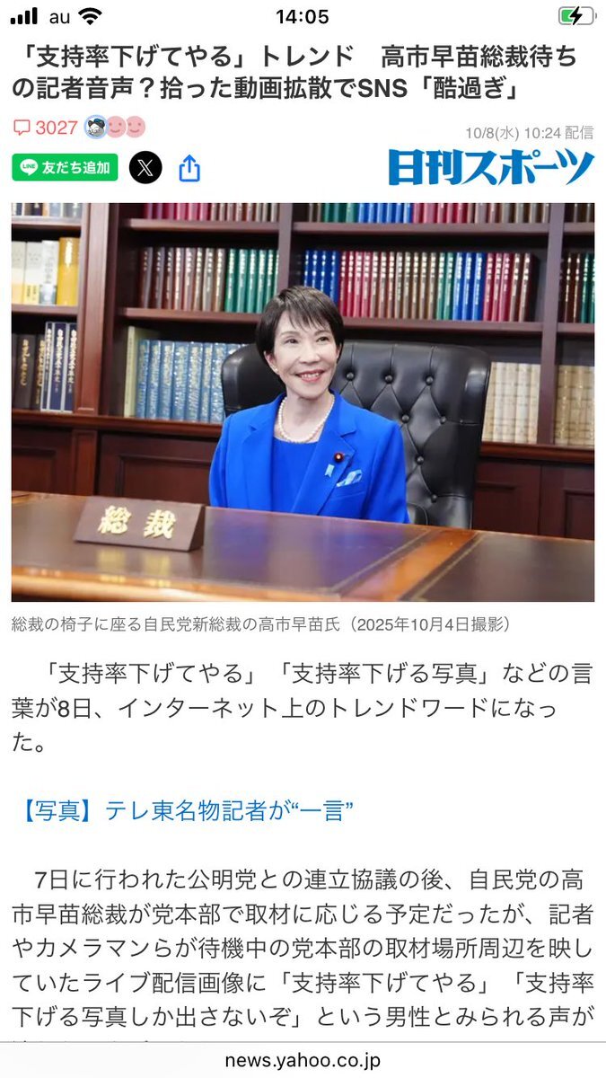 報道陣「支持率下げる」音声拡散 高市総裁の取材対応を待つ一部(共同通信) u.lin.ee/qfVmBzo?mediad…
