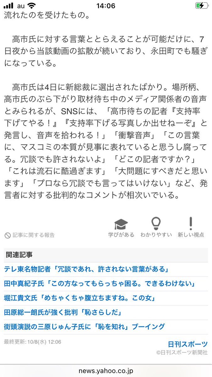 報道陣「支持率下げる」音声拡散 高市総裁の取材対応を待つ一部(共同通信) u.lin.ee/qfVmBzo?mediad… 特定して 名前と顔を公表してください